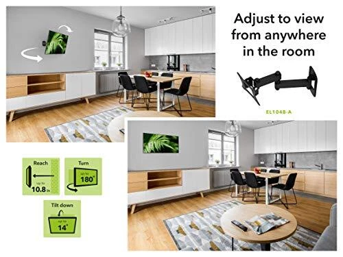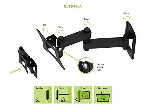 Return Policy Fast Delivery Trusted seller EL104B-A Multi Position, Full Motion, Long Extension TV Wall Mount for 12 Inch to 25 Inch TV or Monitor, Black, Universal Wall Mounting Bracket, VESA 50x50 to 100x100, Easy to Install Product Description Fits TVs up to 25 Inches and 33 lbs Pan, Swivel, Tilt, and extend TV Wall Mount with 2.05" Mounting Profile & 10.83" Extension Supports TVs up to 33 lbs 50x50 - 100x100mm VESA Mounting Patterns East Installation. Instructions and all hardware included Shipping Returns Payment Shipping Shipping is FREE to all addresses other than APO/PO boxes in the lower 48 states. All our stock ships from US-based warehouses. Shipped via USPS or UPS (depending on location and package weight) Unless stated otherwise, all orders will ship within 24-72 hours of your payment being processed. Check our feedback to see the great reviews of FAST shipping we offer. Returns Seller does not accept returns Payment We currently accept payment via eBay managed payments only. Once payment is cleared, we will dispatch your shipment within 1-3 business days. Please refer to the "Shipping" tab for more information regarding shipping speed to your destination.