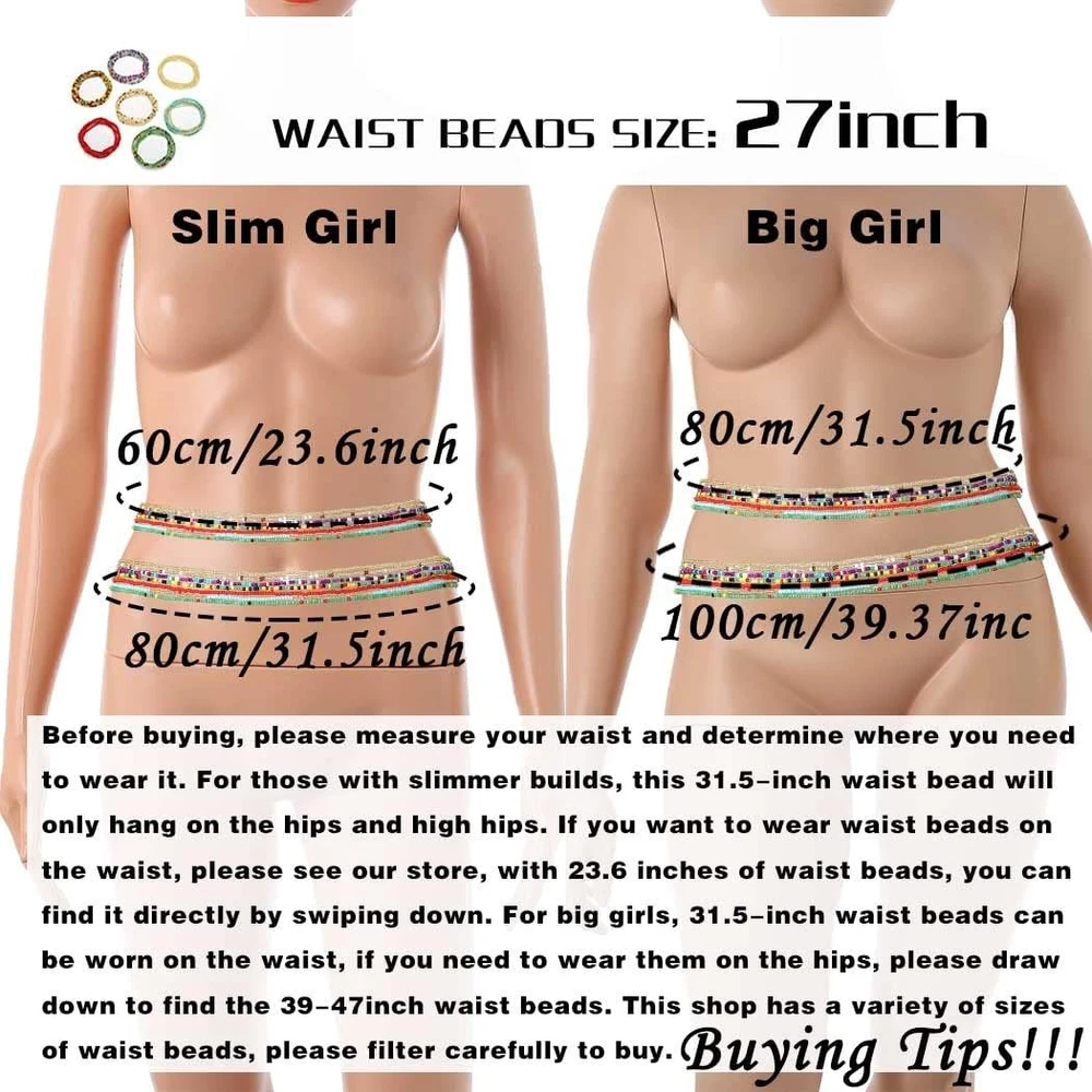 ELABEST African Waist Beads Chain Layered Belly Body Beach 27inch/70cm Product Details Brand, Seller, or Collection Name: ELABEST Metal stamp: No Metal Stamp Metal: No Metal Type Material: Plastic Gem Type: No Gemstone Item Length: 0.39 inches Chain: Bead Clasp: Tie Clasp Product Dimensions : 0.39 x 0.39 x 0.04 inches; 2.08 ounces Department : womens Country of Origin : China