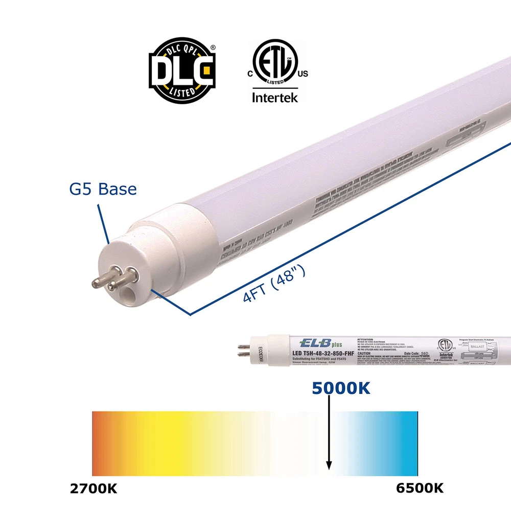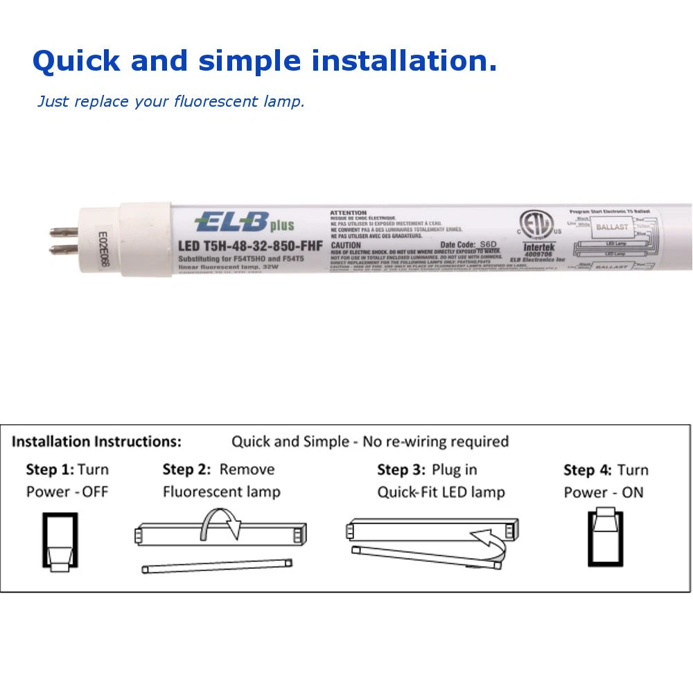 ELB Electronics LED T5 direct replacement lamp for T5 lamp applications. Lamp operates on existing T5 fluorescent electronic ballasts and requires NO Re-WIRING of the light fixture. - Light distribution angle of 280 degrees - Excellent for low temperature applications - Use with occupancy sensors with frequent starting - Instant ON operation - Dimmable with dimming ballast or ELB-LED driver - No flickering - No glass or mercury for safer work environments - Less lumen depreciation compared to fluorescent systems - Meets UL standard 1598c and UL standard 1993 - Long life product (>50,000 hours) - 5 Year manufacturer’s warranty Plug and play (ballast compatible) led T5 ho Installation is easy and saves money, just remove existing fluorescent lamp and install the led linear lamp Instantly achieve 35-40 percent energy savings and excellent lamp life when replacing traditional T5 fluorescent lamps Meets ul standard 1598C and ul standard 1993 DLC Qualified Ballast Required