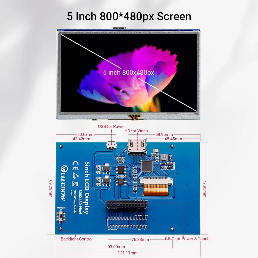 5 inch monitor for Raspberry Pi has a 800*480 LCD screen, high resolution picture, large viewing angle, fast response time, full color display. It supports manual backlight control, backlight switch can be turn off to lower power consumption The screen is resistive touch screen which comes with a touch pen for easy use. When used as Pi touch screen, compatible with Raspberry Pi 5 4 3B+ 3B 2B+, directly plugged, I/Os for touch function and power supply, HD interface for display This mini lcd display can also work with standard HDMI-compatible devices such as PC monitor, please adjust output resolution to 800*480 and use 5V2A power supply to power it; the touch function is not available in this case Package included: 5 inch touchscreen x1, CD x1, touch pen x1, HD adapter x1, copper pillars (4PCS) x1