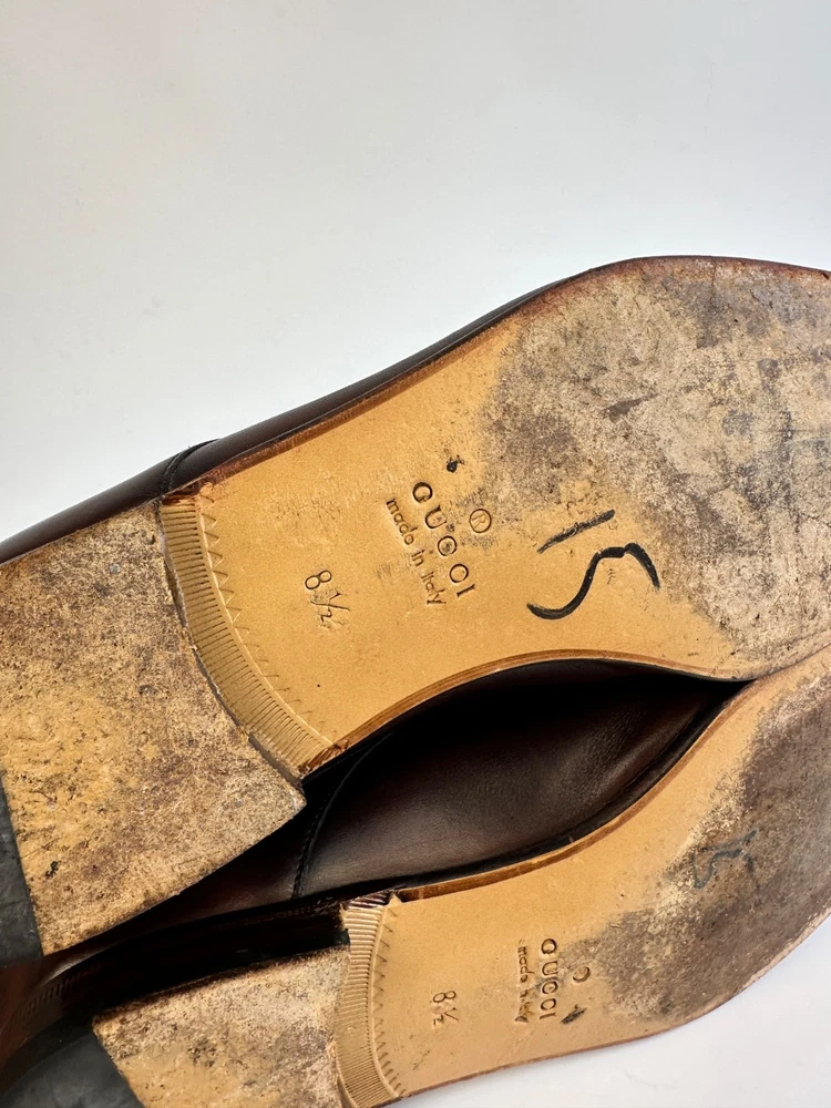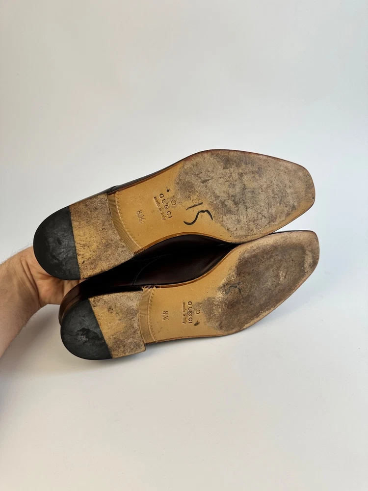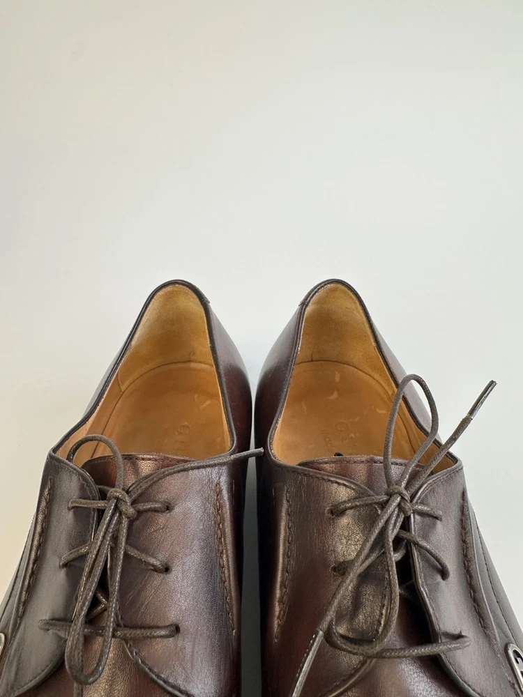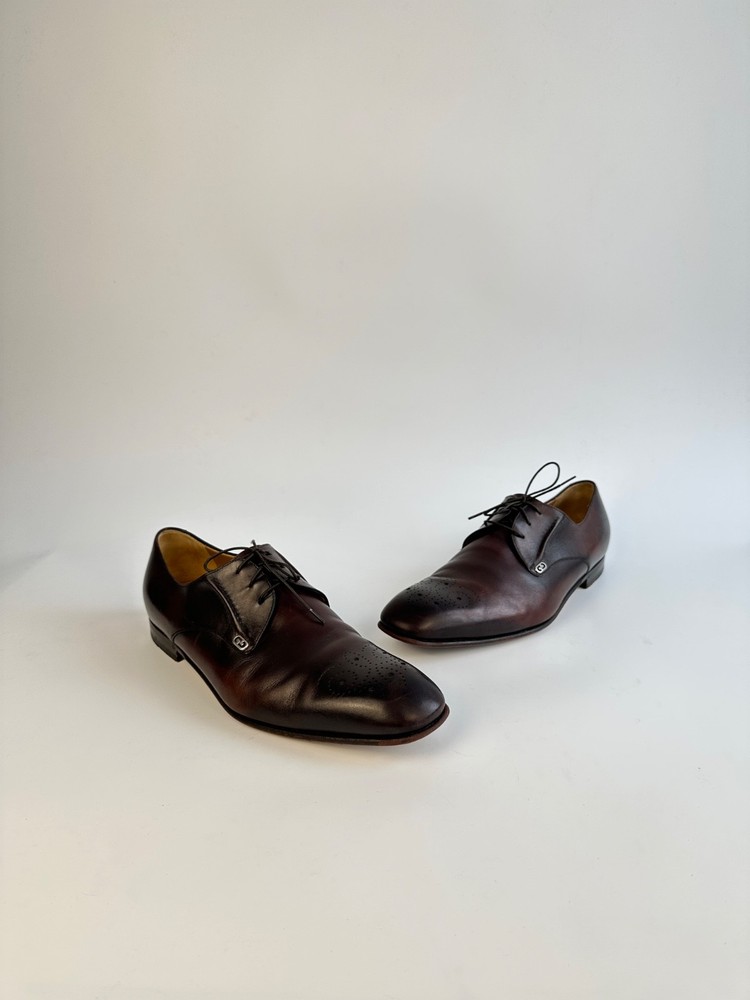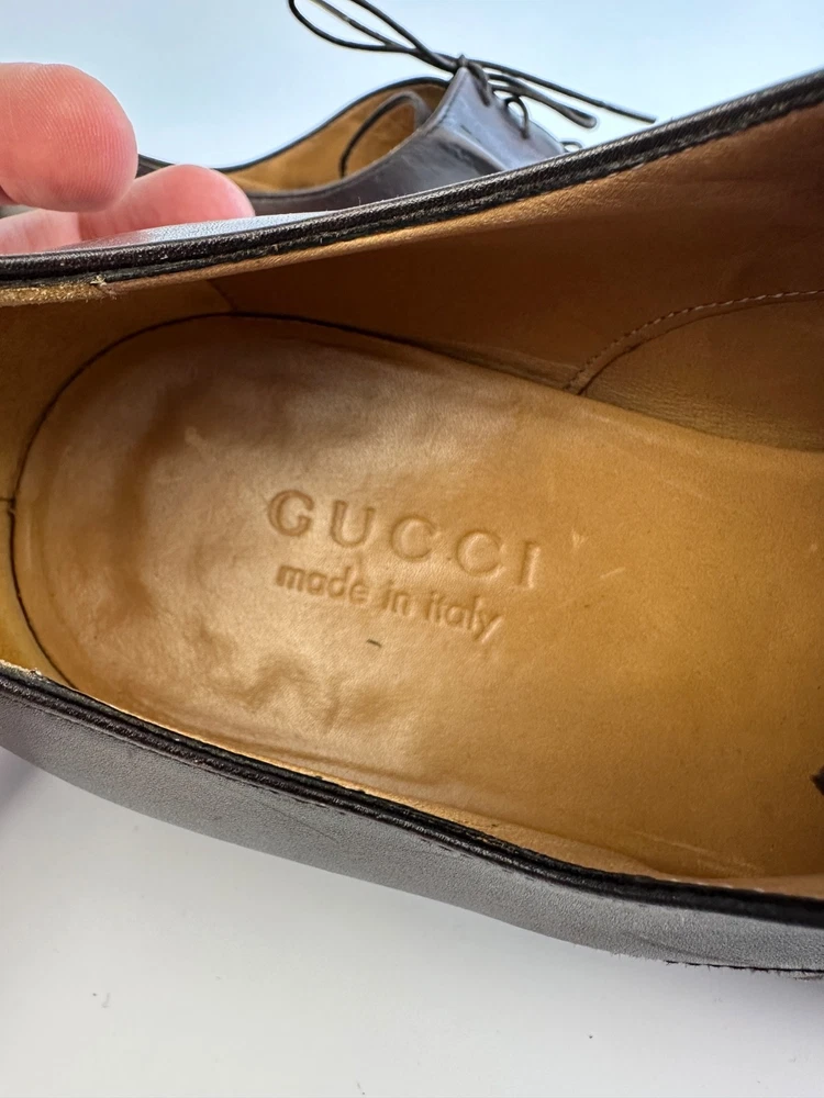 Color: Brown AU Shoe Size: 9.5 UK Shoe Size: 8.5 Lining Material: Leather Country of Origin: Italy Department: Men EU Shoe Size: 42.5 Insole Material: Leather Upper Material: Leather Season: Spring, Fall, Summer US Shoe Size: 9.5 Closure: Lace Up Outsole Material: Leather Style: Derby Type: Dress Brand: Gucci Pattern: Solid