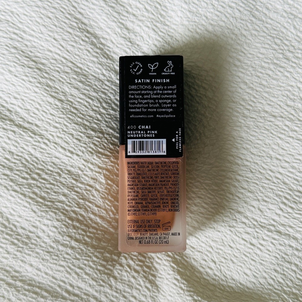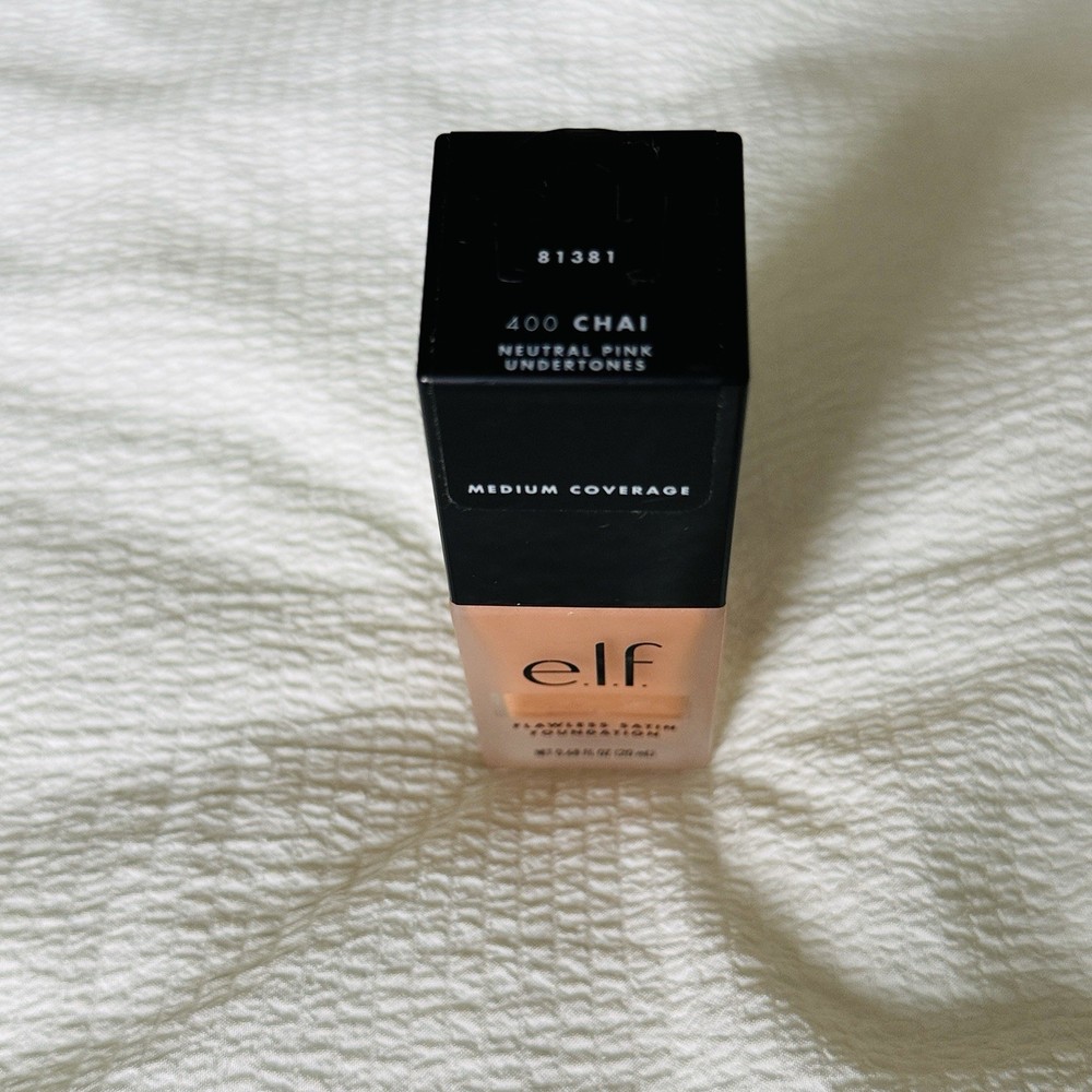 Model:E.L.F Flawless Satin Foundation Shade-Chai 400Period After Opening (PAO):6MType:FoundationVolume:0.68 fl ozBrand:ELFSize:StandardProduct Line:ELFgtin13:609332813816MPN:Does Not ApplyFeatures:Oil-FreeUPC:609332813816Country of Origin:ChinaCustom Bundle:NoShade:ChaiSkin Type:AllCoverage:FullFormulation:LiquidEffect:Matte, Satin