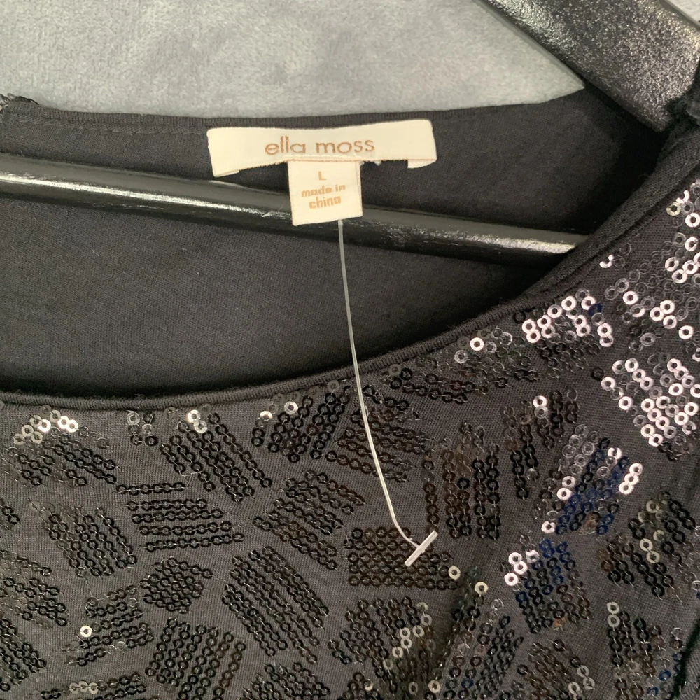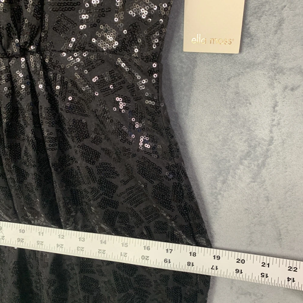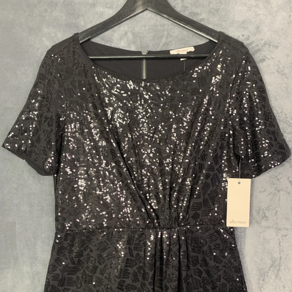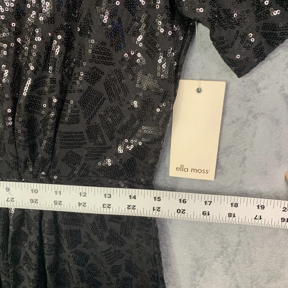 ELLA MOSS Anthropologie Womens Black Cocktail Dress Sequins Gathered Waist Sz L Approximate measurements in inches Underarm to underarm: 19 Waist: 15 Length: 35 Hips: 21 Sleeve: 9 1/2 Hem: 21 1/2 B10