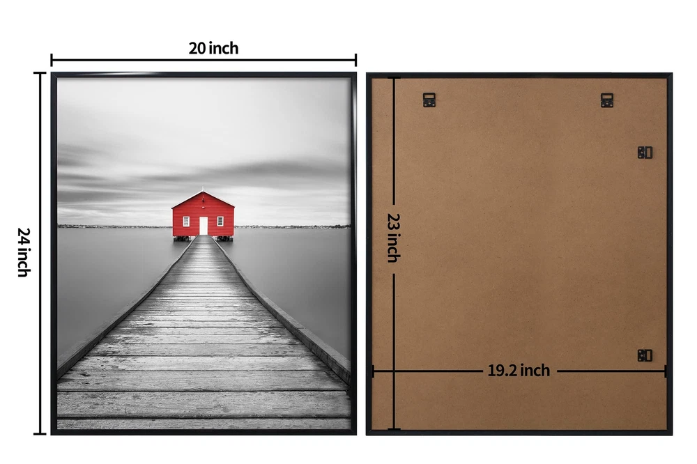 【UNIQUE DESIGN】: This 20x24 frame with aesthetic and modern design is ideal for displaying any of your favorite prints, pictures or photos in your home, office, photo studio, gallery, college, etc. (notice: If your poster or picture is very thin, please secure the backboard and frame with masking tape .) 【SIZES】: Each 20 x 24 picture frame will suit for one 20x24 inch poster or photograph. A set of 3 photo frames of the same size can bring a variety of possibilities to your decorative style. 【LIGHTWEIGHT & STURDY】: This black 20x24 poster frame uses four portable rails and Sturdy MDF backboard to make each frame lighter to handle and easier to use. 【EASY HANGING】: No worries about assembly and hanging. The 4-piece rails could be installed easily by sliding them together, and the preinstalled hanging hardware could be more convenience for you to put them on the wall. 【PACKAGING & GIFT】: Each set of 3 pack 20 x 24 frame was packaged well in a thick box for safety. It will be an excellent present for your loved ones. To ensure that the frames will not be damaged or scratched in transit, our packaging will not include nails for wall mounting.