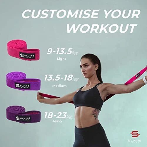 Elvire is committed to driving results by investing in innovate sports equipment for everyday use. We sell a range resistance bands for women, resistance band set, resistance bands long, exercise resistance bands. So, whether you are looking for resistance bands set women. long resistance bands, training bands, resistant bands we have you covered. We are constantly looking for ways to develop our gym bands resistance, workout bands and resistance bands men. Our products cater for a range of different activities – yoga, workouts in the home or gym, tennis, golf, rugby CrossFit. Our products will enable you to be the best. Push you past your personal best Get More from Your Workouts: Elvire pull up bands exercise band set will seriously ramp up your muscle-building gains. A resistance band women & men can use for upper & lower body resistance training & yoga. Cloth resistance bands for pull up assist. Designed by Fitness Experts: Durable & comfortable long bands for working out with anti-slip lining, so you can use the resistance band for pull up assistance. Each long resistance band keeps its shape & elasticity as they are fabric resistance bands Customise Your Workout: Our long loop resistance bands come in 3 grades. Light (9-13.5kg) Heavy (13.5-18kg) & X-Heavy (18-23kg) so you can progress as you use our long workout bands. A versatile fabric exercise band are body bands for working out. Work Out Anywhere: Pull up bands resistance bands long can neatly fit in a gym bag for training on the go. Our cotton resistance bands exercise loops come with a free travel bag & will become your best gym accessory. The ideal long resistance bands. Buy with Confidence: Scientifically proven to work. Exercise bands resistance for women or men are not only easy to use & store but by using Elvire workout bands for just 10 minutes per day for 30 days you will see positive results