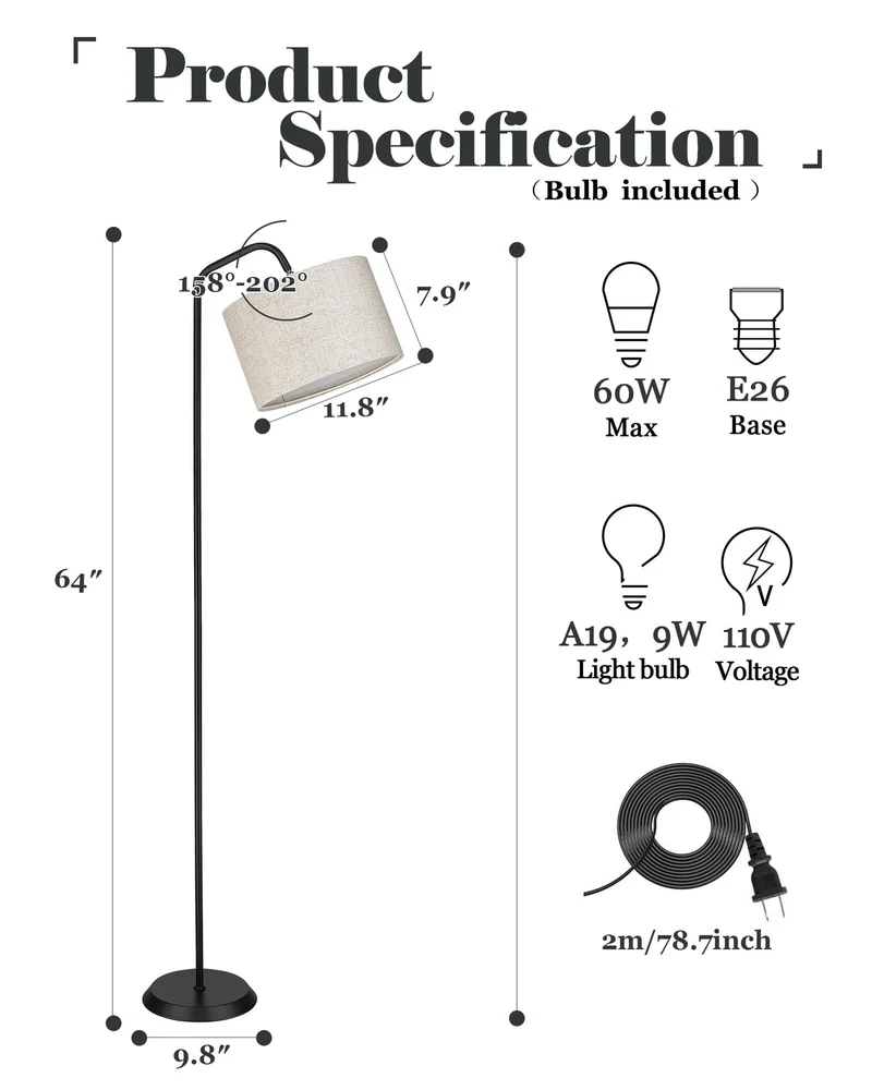 ELYONA Floor Lamp for Living Room with 3 Color Temperatures, Modern Standing lamp with Beige Linen Adjustable Hanging lampshade, Tall Pole Reading Lamp with 9W LED Bulb for Bedroom, Office, Black đăETL Listed & 3 Color Temperatures LED Bulb IncludedăELYONA modern floor lamp includes a 9 watt,800 lumen, LED E26 bulb.This arc floor lamps bulb has 3-color temperatures that can be adjusted:3000K/4000K/5000K. Long lifespan 30, 000 hours lifetime of the bulb can save your money greatly,provide a gentle ambient brightness to create a comfortable environment and cozy for your eyes.â„( pls assure the replace bulb is less than 60 WattsïŒ đăHigh Density Adjustable Rotatable Nature Linen ShadeăThe tall lamp adopts a rotating lamp head,can be rotated up to 270°horizontally or 120°vertically, It can be focused on any area you want to read, study, and work or rest. We use high-quality primary color linen with tight texture, Water&oil-resistant nature linen shade, making the light more comfortable. đă 6.6 lb Sturdy Safe Heavy Base ăThis floor lamp is about 64 inches high , Passed 15 degree tilt test. With a heavier base that keeps it stable and won't tip over easily. 6.6 lb weighted metal base which is not flimsy, heavy enough make sure children and pets' safety when they are playing in the room. đăClassic Beige Designă Black reading standing lamp with beige linen shade which is classic will never be outdate. The height of floor lamp is 64 inches which is the most proper height to offer soft lighting and create a cozy and relaxed atmosphere when you lie on the sofa or sit on a chair, perfect for reading, work, or rest. It easy to match with a range of decor styles including modern, industrial space, farmhouse, nordic,japanese etc. Perfect for living room, bedroom,office, hotel. đăEasy Installation & ON/OFF Foot Switchă No need any tools only takes about 10 minutes, you can finish this standing accent floor lamp, Convenient footswitch allows you to easily turn the floor lamp on or off without having to bend down. We provide a 1-year warranty, if you have any questions, please feel free to contact usïŒwe will respond within 24 hours to provide the most satisfactory solutions and services. Shipping We offer FREE shipping on all orders! We ship within Three business days of payment, usually sooner. We use a selection of shipping services such as UPS, FedEx, USPS etc. We only ship to the lower 48 states, no APO/FPO addresses or PO Boxes allowed. Local pickups and combined shipping options are not provided at this time. Return You can return a product for up to 30 days from the date you purchased it. Any product you return must be in the same condition you received it and in the original packaging. Please keep the receipt. Payment We accept payment by any of the following methods: PayPal Please pay as soon as possible after winning an auction, as that will allow us to post your item to you sooner! Feedback Customer satisfaction is very important to us. If you have any problem with your order, please contact us and we will do our best to make you satisfied. Contact Us If you have any queries, please contact us via ebay. We usually respond within 24 hours on weekdays. Please visit our eBay store to check out other items for sale! Thank you for shopping at our store.