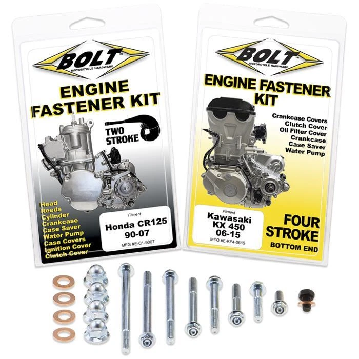 Engine Fastener Kits come with modern dimpled flange bolts. With a bright zinc finish, these fasteners last long and give a clean, updated look to any engine. Two-Stroke Engine Fastener kits have all the external fasteners from top to bottom-end including hardware for: Heads, Reeds, Cylinder, Crankcase, Case Saver, Water Pump, Left Case Cover, Ignition Cover, Inner & Outer Clutch Covers, Power Valve Covers. Four-Stroke Engine Fastener kits include bottom-end hardware for the following: Crankcase Covers, Clutch Cover, Oil Filter Cover, Crankcase, Case Saver, Water Pump and various top-end bolts depending on model.