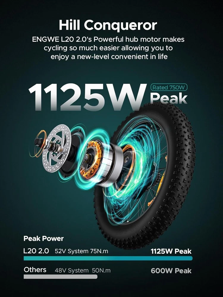 Engwe L20 2.0 Electric Bike Frame & Build: Constructed from durable 6061 aluminum alloy , this e-bike offers a sturdy yet lightweight design, weighing **68.3 lbs (31 kg)** with a total payload capacity of 264 lbs (120 kg) . Motor & Performance: Powered by a robust 750W (1125W peak) hub motor , it delivers strong 75 Nm of torque , ensuring smooth acceleration and hill-climbing ability. The bike reaches a top speed of 20 mph (32 km/h) in throttle mode and 28 mph (45 km/h) in pedal-assist mode. Battery & Range: Equipped with a 52V 13Ah lithium-ion battery , it provides an impressive 68 miles (109 km) of range in PAS 1 mode and 28 miles (45 km) at full speed (28 mph) . Recharging takes approximately 6.5 hours. Tires & Brakes: Features 20 x 3.0-inch wide tires for stability and traction, paired with **180mm mechanical disc brakes** for reliable stopping power. Drivetrain & Gearing: Includes a Shimano 7-speed transmission , allowing for versatile riding across different terrains. Rider Compatibility: Designed for riders between 5.0 to 6.0 feet (155โ€“185 cm) tall, making it suitable for a wide range of users. Ideal For: Commuting, leisure rides, and moderate off-road adventures with a balance of speed, range, and durability. ๐…๐จ๐ฅ๐๐š๐›๐ฅ๐ž ๐ƒ๐ž๐ฌ๐ข๐ ๐ง & ๐Ÿ“ ๐‘๐ข๐๐ข๐ง๐  ๐Œ๐จ๐๐ž: Foldable design shrinks the space of the bike, the size of the e-bike after folding is 40.2*17.7*31.5inches (102*45*80CM) , if you like excursions, hiking and riding, you can put the bike into the car, and the 5-speed riding modes and 7 -speed gearbox can provide a variety of choices. ๐…๐ซ๐จ๐ง๐ญ ๐…๐จ๐ซ๐ค & ๐’๐ž๐š๐ญ๐ฉ๐จ๐ฌ๐ญ ๐’๐ฎ๐ฌ๐ฉ๐ž๐ง๐ฌ๐ข๐จ๐ง๐ฌ: The e-bike adopts high-strength shock absorbing fork and seatpost, which can absorb the bumps of long-distance rugged road. The 20*3.0 fat tires with granular pattern grip the ground more powerfully and anti-skid, and the 180mm armored disc brake disc, the brakes are more sensitive and stable, which enhances the comfort of your ride. E-bike is suitable for riding on urban roads, snow, beaches, rugged mountain roads. What's in the box? L20 2.0 E-bike*1 52V13Ah Lithium-Ion Battery*1 Battery Charger*1 Assembly Tool kit*1 Pedals*2 English User Manual*1 Note: This bike does not come with a front basket Product Description Note: Our products have been certified under UL2849 safety standards