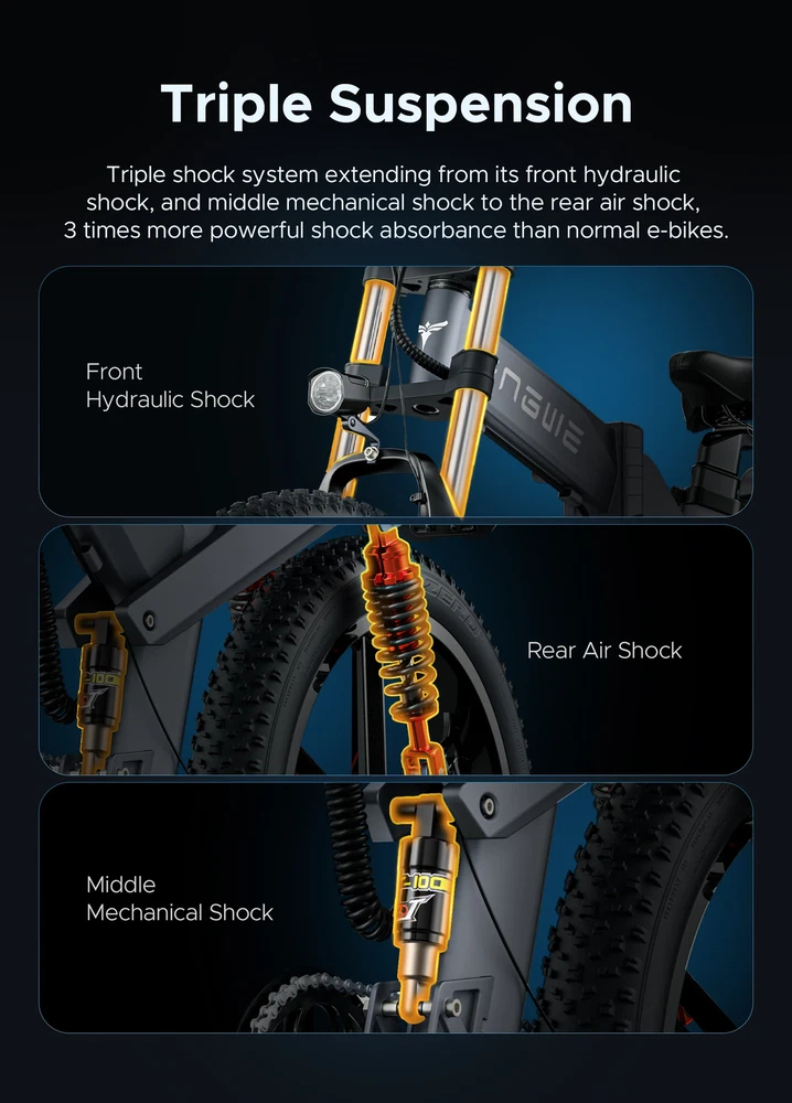 About this item: *Powerful Motor E-bike: The X26 is a powerful all-wheel drive electric bike for adults. 1200W brushless motor with Shimano 8-speed gear for an easy ride, with a top speed of about 31MPH, with a long range of more than 93 miles. Equipped with 48V, 29.2AH detachable lithium battery( Battery 2:48v 10ah Lithium-Ion Battery) Charging time: Approximately 5-8 hours, 2000 cycles of charging. *Fat Tires 26"x4.0" Ebike: Fat Tire and front suspension to ride smoothly on any terrain, including rocky roads, sandy beaches, snowy suburbs and so on. *Hydraulic Disc Brakes: Hydraulic Disc Brakes & Fat Tires:The electric dirt bike is equipped with outstanding features, including 26*4.0-inch fat tires and 180mm hydraulic disc brakes. Weighing only 96lb, this foldable and portable electric bike is stable, for riders between 5.6 to 6.5 feet tall and weighing up to 330lb. Its rugged tires excel on both dirt and road surfaces. And with headlights, this folding ebike is suitable for nighttime rides, guaranteeing safety and security during your evening adventures. *48V 29.2AH ENGWE Battery : Powered by 48V 29.2A removable Lithium single Battery and a powerful 1200W (peak) electric motor, this adult electric bike guarantees limitless exploration. Enjoy electric range of 62 miles in Throttle mode, allowing you to embark without worrying about power. With the PAS mode (Pedal assist mode), you'll be able to push your boundaries, reaching up to a remarkable 95 miles. Discover a new level of exhilaration and freedom with the ENGWE X26 E-bike *4 Riding Modes: This electric bike offers a range of riding modes to suit your preferences. You can choose from pure electric mode, pedal assist mode, classic bike mode, or even activate cruise control mode for easy riding. Each mode has its own unique benefits, allowing you to enjoy a customized riding experience every time. *440 LBS Max Capacity: ENGWE Ebike is framed by Aluminum which brings a more reliable safety system than other brands. Adjustable seat fits. The bike weighs 80 lbs and has a max load capacity of 440 lbs. The triangular Aluminum frame is extremely stable and strong to handle weight and pressure, which is friendly for people with taller or stronger and take you anywhere. *Easy installation: 85% of the bike is pre-installed, you only need to manually install a few simple accessories. *1 Year Warranty: We provide 1 year warranty. If you have any questions about this item please directly contact us. Warm Tips: * New electric bike passes road test before packing, therefore dust on the tires is inevitable. * Upon arrival, mark down the serial number, which locates on the middle axle tube, and register to vehicle management center. It is necessary to track your ebike while preventing loss. ENGWE X26 EBIKE All-Terrain Performance Beast X26 Vehicle Weight: Dual Battery Version: 96Lbs (43.6KG); Single Battery Version: 84.8Lbs (38.5KG) Specification: Bike Type E-Bike Age Range Adult Brand ENGWE Number of Speeds Shimano 8 Gears Color Black Wheel Size 26"x4.0" Brake Style Hydraulic Disc Brakes Frame 6061 Aluminum Alloy Brake Hydraulic Disc Brakes Suspensions Triple Suspensions Throttle Twist Throttle on the Right side of Handlebar Display Smart LCD display that shows speed, battery status, pedal assist level, etc. Range 93 Miles(ECO Mode) Voltage 48 Volts Model Name X26 Wattage 1200 watts Hub & Power Integrated Hub Motor with 1000W power Motor 1200w(peak) High-Speed Brushless Motor Item Weight 96 lbs (43.6 kg) Maximum Weight Recommendation 330 lbs (150 kg) Warranty 1 year Suggested Users Unisex-adult Note: Our products have been certified under UL2849 safety standards.