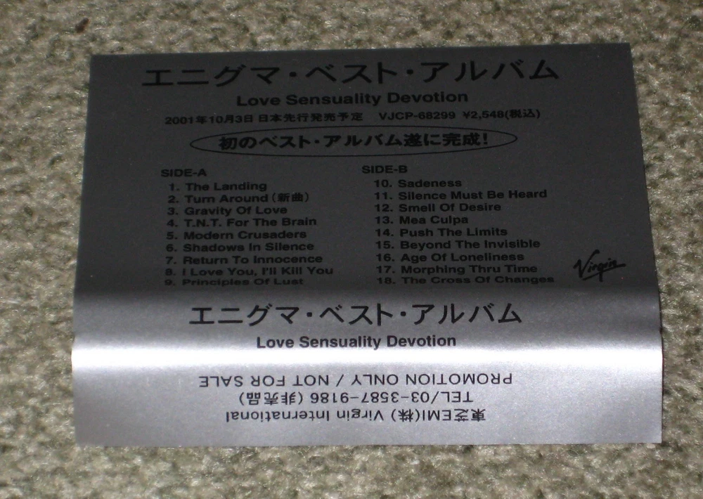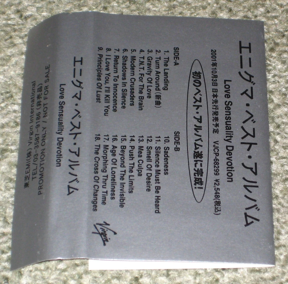 We have other Japanese deleted and PROMO CDs, cassettes, laserdiscs and more by ENIGMA and related (SANDRA etc) in stock - contact us for details! ARTIST : Enigma TITLE : Love Sensuality Devotion CATALOGUE NUMBER : VJCP-68299 CONDITION (SLEEVE): M- (some creasing and storage wear, very nice used condition). CONDITION (CASSETTE): EX+ (both labels have some 'bubbles' from air trapped under the label, so are raised/creased in a couple of places. See scan). CONDITION (CASE): EX+ (normal wear and scuffs). OTHER DETAILS: Official Japanese PROMO ONLY cassette tape with original promo only sleeve! This ultra rare record company tape was distributed only to selected music writers ahead of the official CD release and was never on sale in stores. This is the ONLY official Japanese cassette format issue of this album! Shipping & handling rates - Registered/signed-for airmail shipping with insurance is $8 to North America, Asia, Europe & Oceania. Rates for South America and Africa on request. Extra cassettes in the same parcel add $2 per cassette. We can accept payment via PAYPAL. Buyer is liable for any import taxes that may be charged by your country. Appropriate feedback is left for ALL deals. Payment must be sent within 3 days of the auction close and please don't bid if you aren't going to buy!! Thank you.