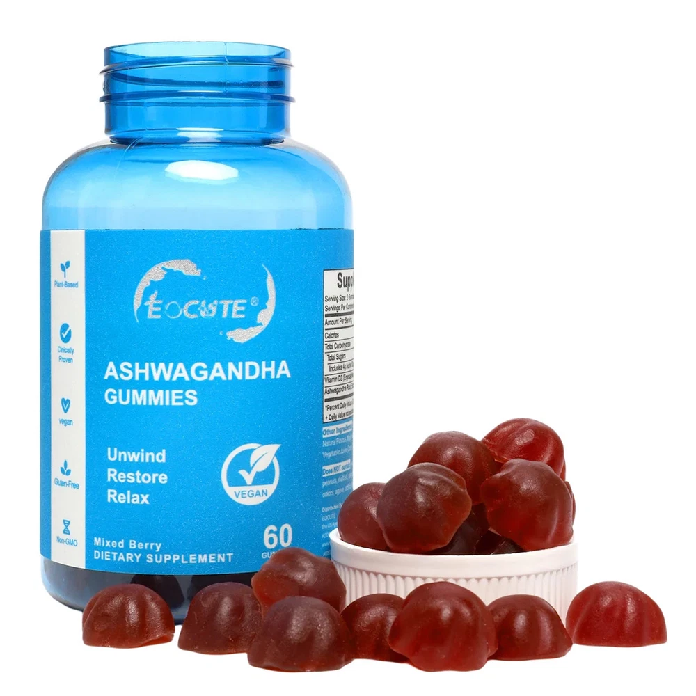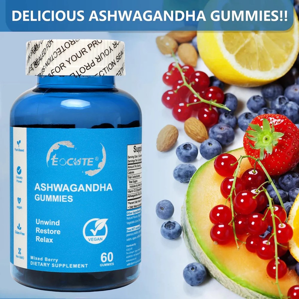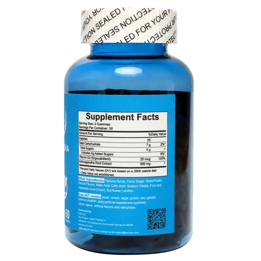 EOCUTE Ashwagandha + Vitamin D Gummies Support your daily wellness with these mixed-berry, plant-based gummies formulated with KSM-66 Ashwagandha and Vitamin D . Designed to help you unwind, restore balance, and relax , each gummy is vegan, non-GMO, and completely gelatin-free—making it suitable for both women and men. Crafted for everyday stress support and overall mood wellness, these gummies combine high-quality herbal ingredients with a naturally delicious flavor. Perfect for those looking for a simple, enjoyable way to incorporate adaptogens and vitamin D into their routine. Key Features: KSM-66 Ashwagandha for stress and relaxation support Vitamin D to promote immunity and overall health Vegan, Plant-Based, Non-GMO Gluten-Free & Gelatin-Free Mixed berry flavor Easy, tasty daily supplement