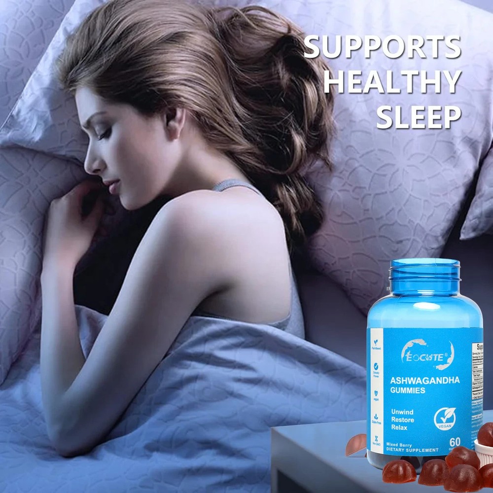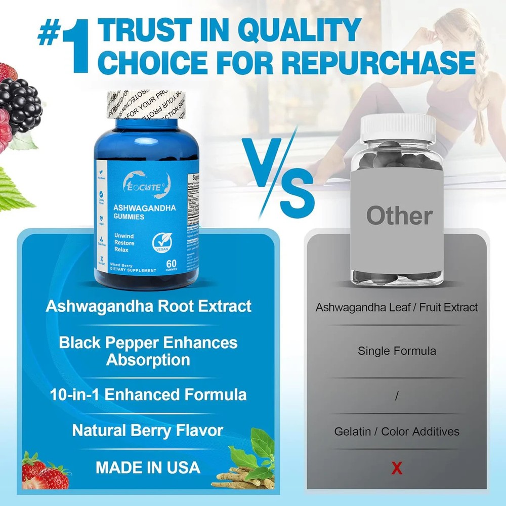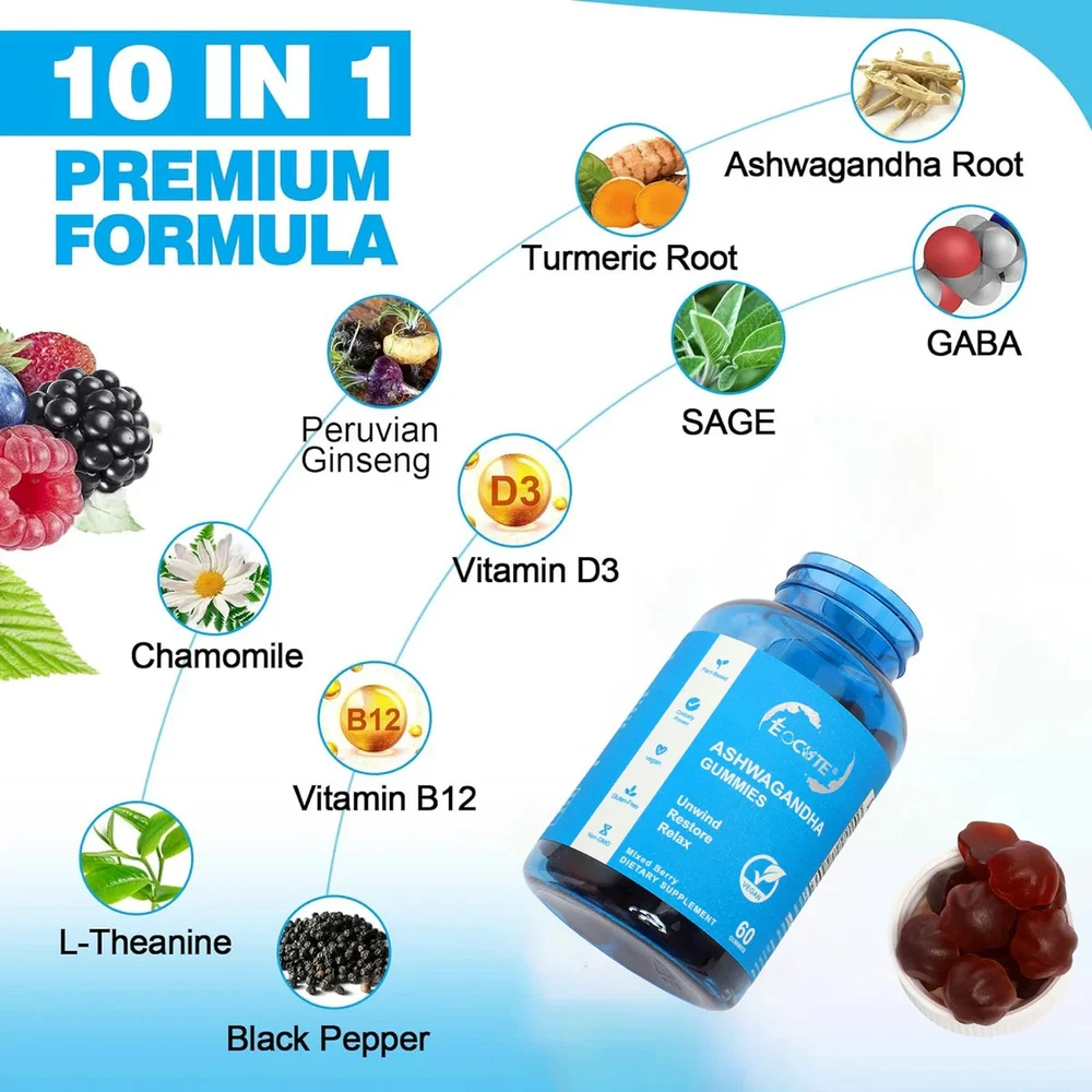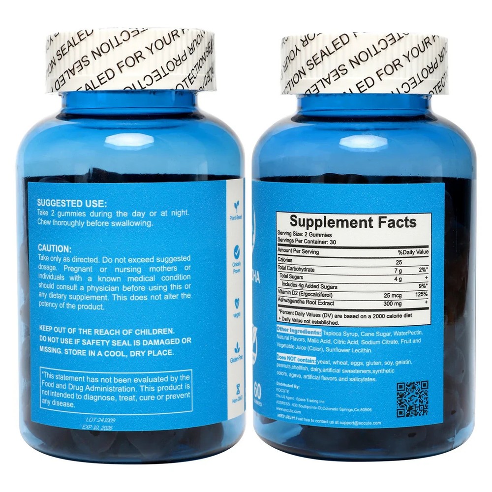 EOCUTE Ashwagandha + Vitamin D Gummies Support your daily wellness with these mixed-berry, plant-based gummies formulated with KSM-66 Ashwagandha and Vitamin D . Designed to help you unwind, restore balance, and relax , each gummy is vegan, non-GMO, and completely gelatin-free—making it suitable for both women and men. Crafted for everyday stress support and overall mood wellness, these gummies combine high-quality herbal ingredients with a naturally delicious flavor. Perfect for those looking for a simple, enjoyable way to incorporate adaptogens and vitamin D into their routine. Key Features: KSM-66 Ashwagandha for stress and relaxation support Vitamin D to promote immunity and overall health Vegan, Plant-Based, Non-GMO Gluten-Free & Gelatin-Free Mixed berry flavor Easy, tasty daily supplement