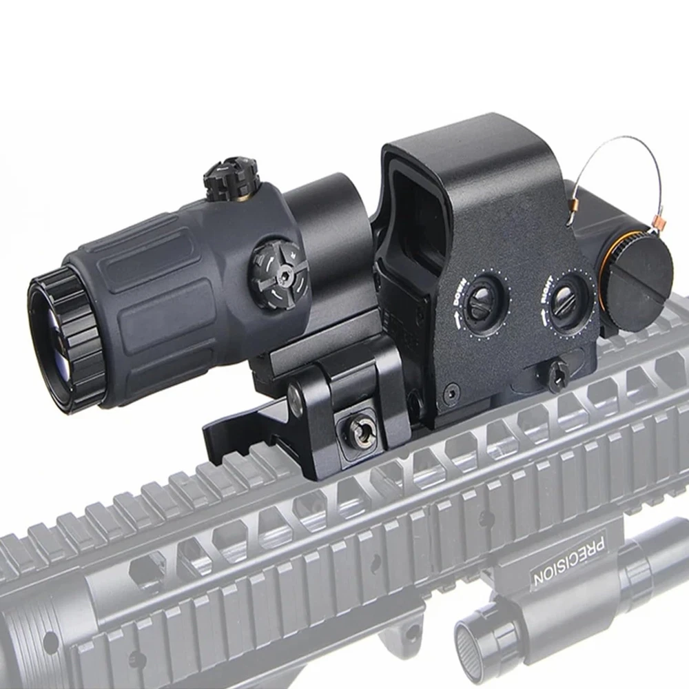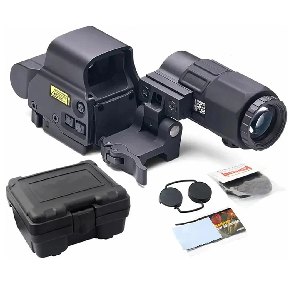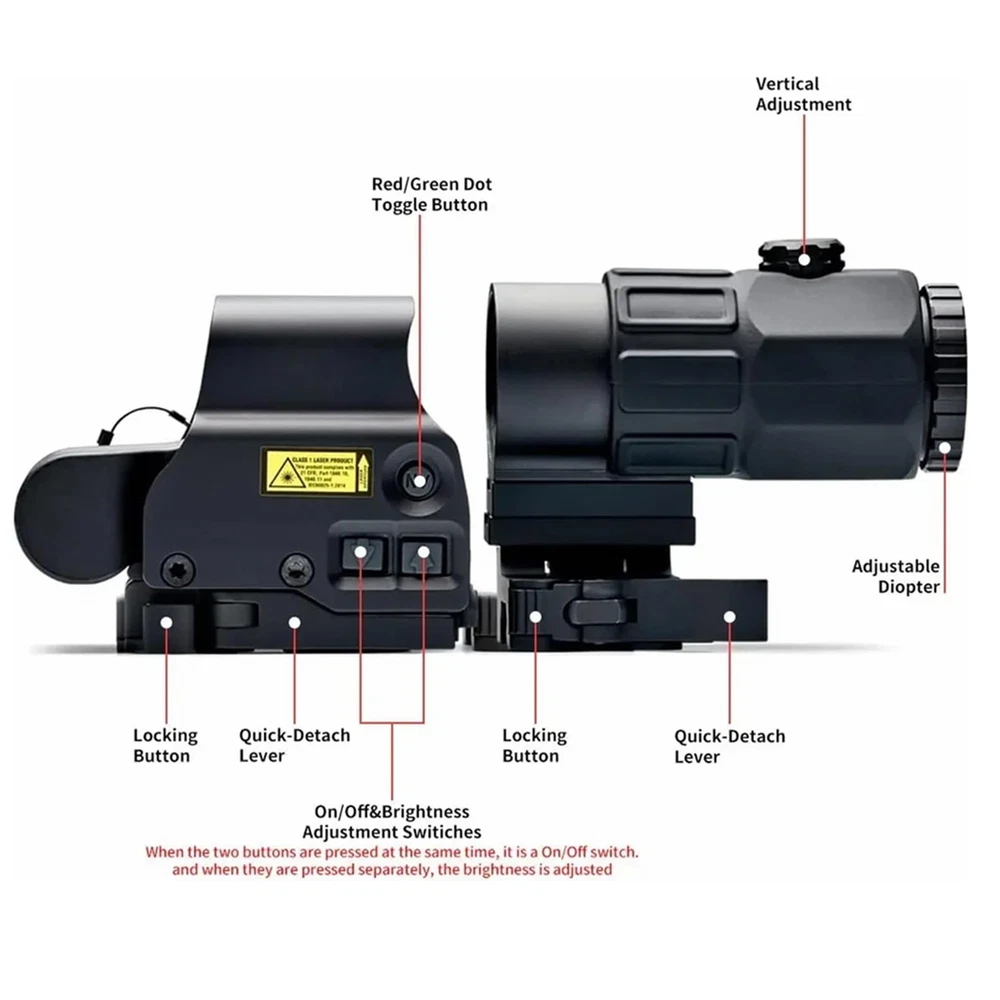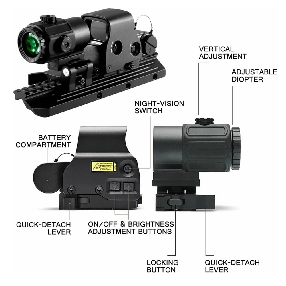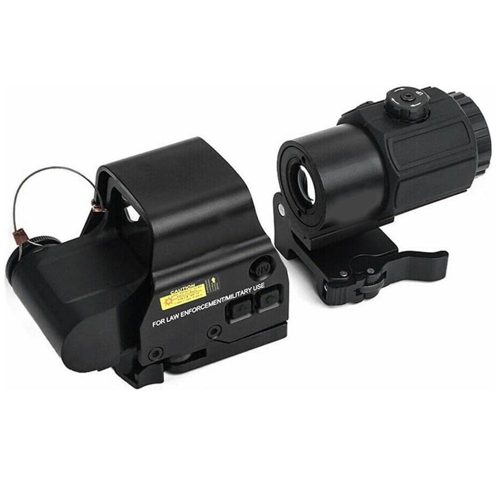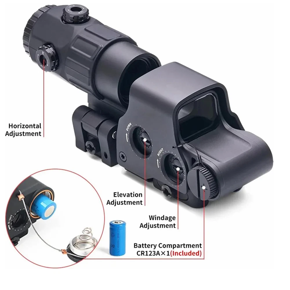 The 558 Red&Green Holographic Sights+ G33/G43/G45 3x/5x Magnifier Red and Green Dot is a high-quality optic designed for hunting enthusiasts. This holographic sight features a Picatinny rail mount for easy installation on your firearm. With a maximum magnification of 5x and adjustable red and green reticle colors, this sight allows for precise aiming and target acquisition during outdoor adventures. Powered by batteries, this black sight is durable and reliable for all your hunting needs. Description G45 Magnification: 5X Objective Lens Diameter: 25mm Eye Relief: 2.6 inch Linear Field of View: 23.3feet @ 100 yds Angular Field of View: 7.28 degrees Material: 6063 all-aluminum alloy structure Appearance size: 100*50*80MM Net weight: 334.5G Gross weight: 460G Glass: Multilayer Broadband Green Film Glass G43 : Fixed Magnification: 3 X Overall Length: 2.9″ (in) Material: 7065 Alumnium Alloy Made, Hard Anodized Eye Relief: 2.6"(67 mm) Field of View: 7.5° Sealing Fog Resistant internal Optics Water Resistance:33 ft. (10 m)depth Easy to install and setup, Integrated 5/8" 20mm Rail, with built-in quick detachable, Fits any 20mm Rail or Mounts to 1" Weaver or MIL-STD 1913 rail, both can 558 Magnification: 1x Reticle: Red / Green Dot Exit pupil distance: 20 (mm) Exit pupil diameter: 40 (mm) Field of view: 15.8M-100M Maximum Output Power:>1MW,<5MW Quick-detach lever for easy attachment and removal Fits for 20mm rail Power Supply: 1* CR123A(no included)