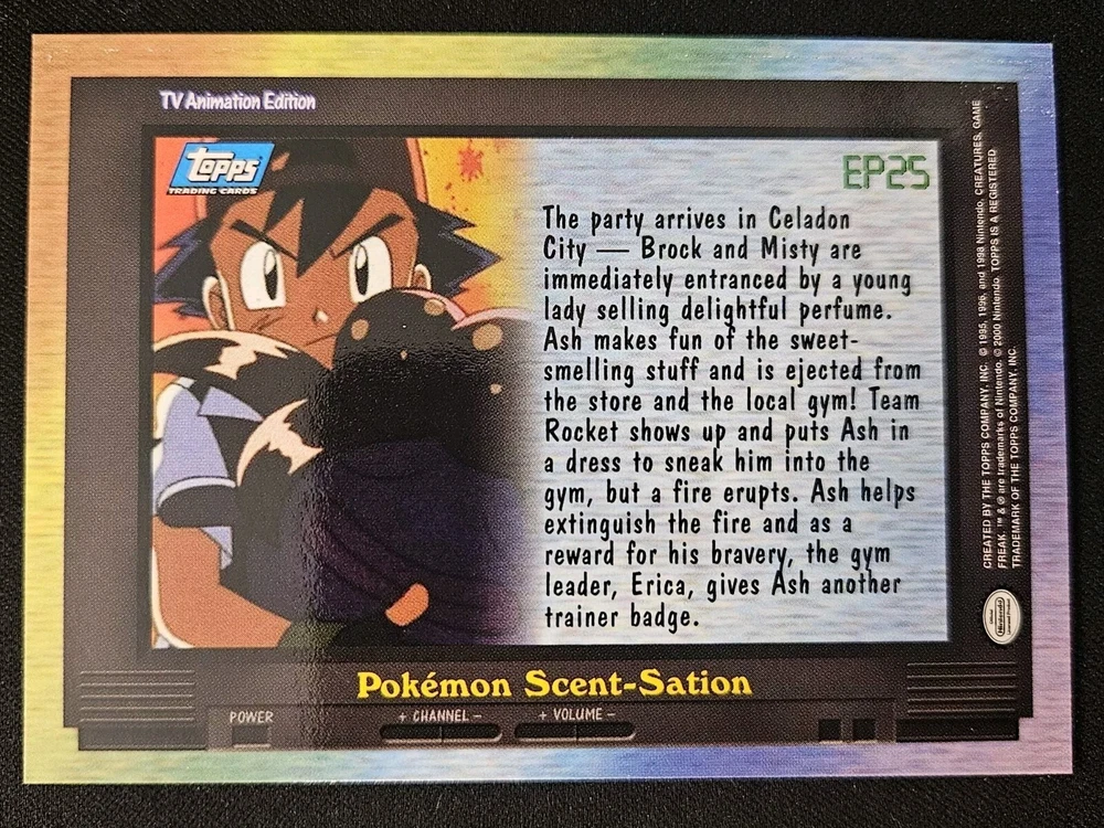 EP25 Pokémon Scent-Sation Topps Series 2 TV Animation Ed. Blue Label Pokémon NM. NM is an estimation. Please see pictures and reach out with any questions before purchase and we would be happy to assist you. Shipping info: All graded cards are shipped securely in bubble mailer and cardboard box; regardless of price. TCG singles/playsets are shipped PWE with tracking when applicable. Single cards will be packaged with penny sleeve, top loader and team bag. Playsets will be penny Sleeved in a Card saver 2. Please note that PWE orders will have fewer tracking updates and may show delivered when scanned through your states/cities sortation center or post office. Final delivery may take up to 5 days after this date to arrive to your home. PWE orders from Puerto Rico need to have The United States listed as your country. Orders with Puerto Rico listed as the country cannot be shipped and may be cancelled. Please reach out with any concerns before contacting ebay and we'd be happy to assist you. Please note that due to inventory accuracy, purchases will not be cancelled before or after shipping. Please reach out with any questions before purchase and we would be happy to assist you.