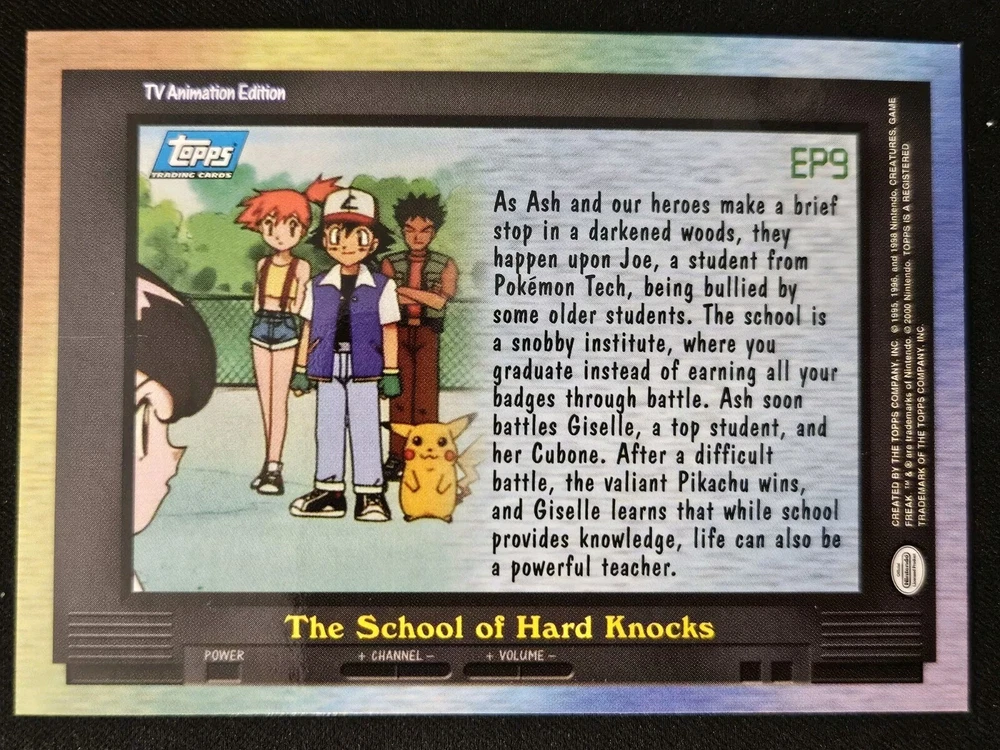 EP9 The School Of Hard Knocks Topps Series 2 TV Animation Edition Blue Label Pokémon NM. NM is an estimation. Please see pictures and reach out with any questions before purchase and we would be happy to assist you. Shipping info: All graded cards are shipped securely in bubble mailer and cardboard box; regardless of price. TCG singles/playsets are shipped PWE with tracking when applicable. Single cards will be packaged with penny sleeve, top loader and team bag. Playsets will be penny Sleeved in a Card saver 2. Please note that PWE orders will have fewer tracking updates and may show delivered when scanned through your states/cities sortation center or post office. Final delivery may take up to 5 days after this date to arrive to your home. PWE orders from Puerto Rico need to have The United States listed as your country. Orders with Puerto Rico listed as the country cannot be shipped and may be cancelled. Please reach out with any concerns before contacting ebay and we'd be happy to assist you. Please note that due to inventory accuracy, purchases will not be cancelled before or after shipping. Please reach out with any questions before purchase and we would be happy to assist you.