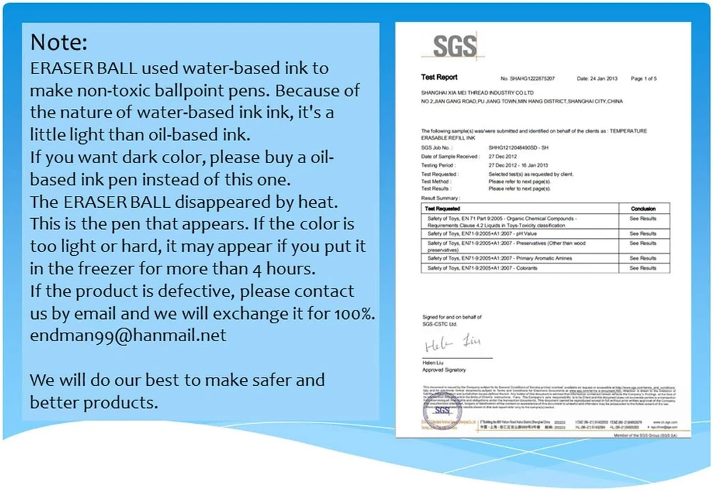 Five Pen set. Combines the convenience of a retractable with the incredible ERASER BALL erasable gel ink Erase and rewrite repeatedly without damaging documents Eraser is at the top of the pen; tip is retractable by pressing clip down. Non Toxic Ink, suitable for you or kids. Please Note: Do Not Sign Your Name in Importable Document with this Erasable Pens. Combines the convenience of a retractable with the incredible ERASER BALL erasable gel ink Erase and rewrite repeatedly without damaging documents - Eraser is at the top of the pen; tip is retractable by pressing clip down. Non-Toxic Ink, suitable for you or kids. Please Note: Do Not Sign Your Name in Importable Document with this Erasable Pens