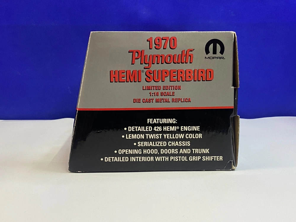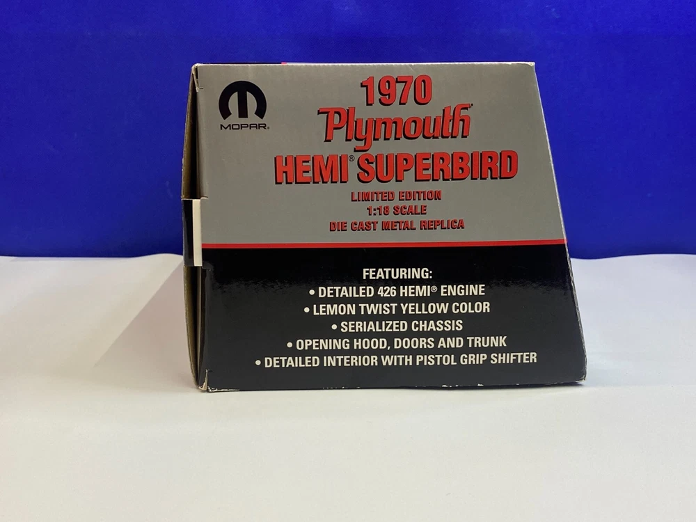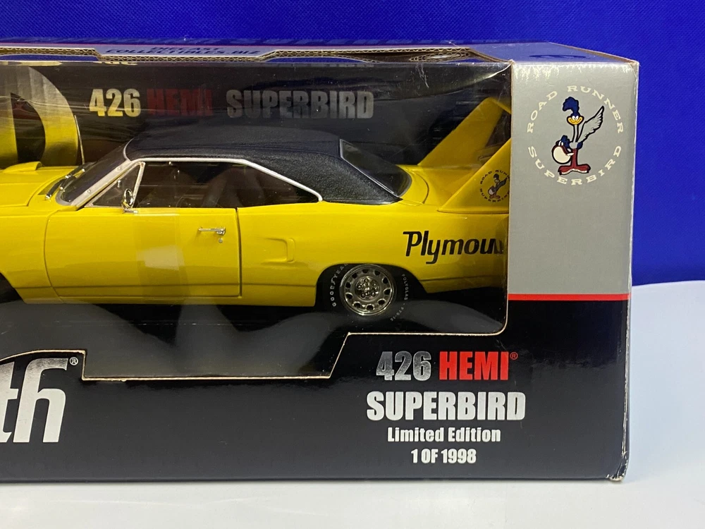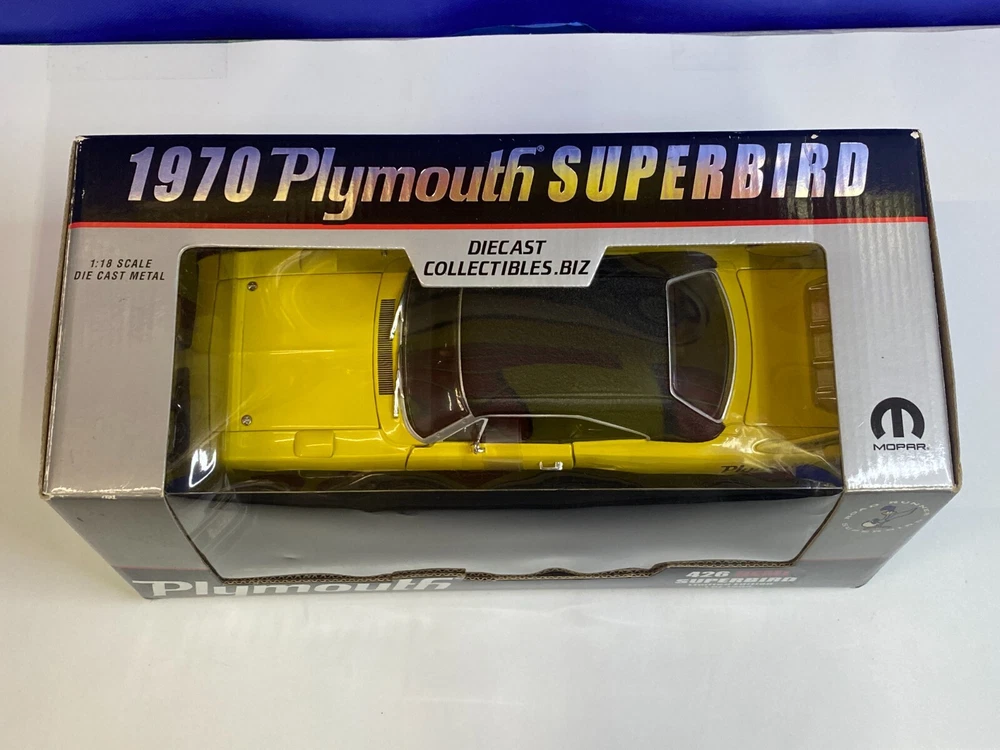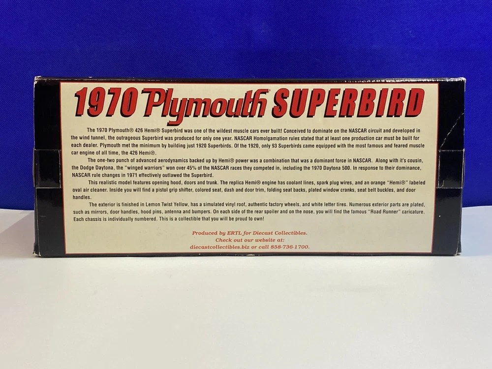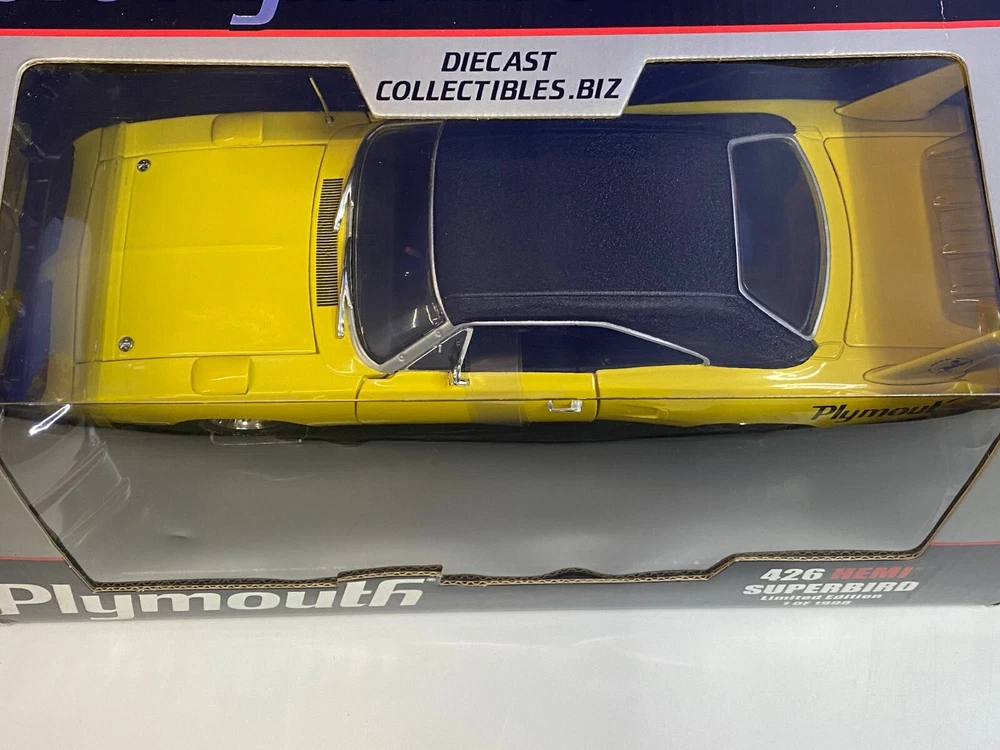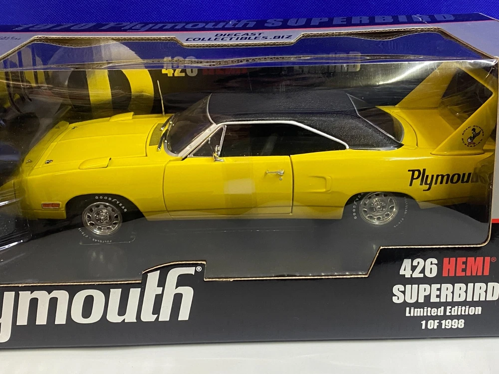 UP FOR YOUR CONSIDERATION IS AN ERTL 1/18 SCALE YELLOW 1970 PLYMOUTH SUPERBIRD 426 HEMI. ITEM IS 1 OF 1998. ITEM IS NEW IN PACKAGE. CAR AND BOX LOOKS TO BE IN GOOD CONDITION. CHECKOUT PICTURES FOR FURTHER DESCRIPTION. THE ITEM IN THE PICTURES IS THE ITEM YOU WILL RECEIVE. ITEM WILL BE PACKAGED AND SHIPPED WITH CARE. THANKS FOR LOOKING.. I PACK ALL ORDERS WITH CARE AND SHIP THEM IN A TIMELY MANNER TO ENSURE SAFE ARRIVAL OF YOUR GOODS. IF SOMETHING ARRIVES AND IS NOT TO YOUR SATISFACTION, PLEASE LET ME KNOW AND I WILL MAKE IT RIGHT. FEEDBACK WILL BE GIVEN TO BUYERS, WHEN FEEDBACK IS GIVEN TO SELLER. THANK YOU FOR YOUR BUSINESS.