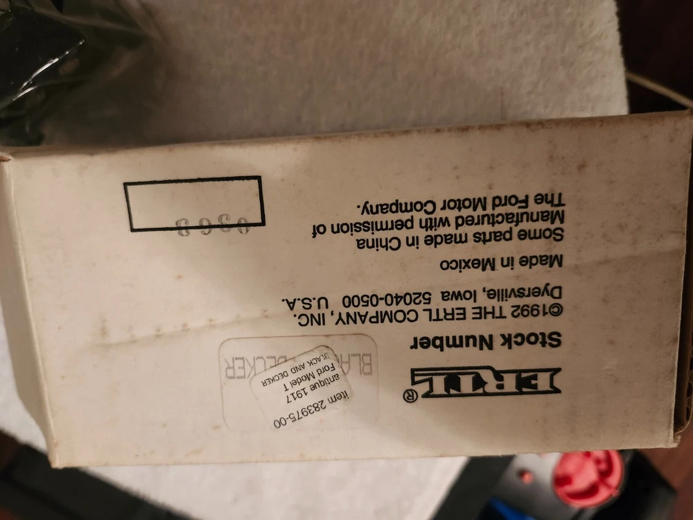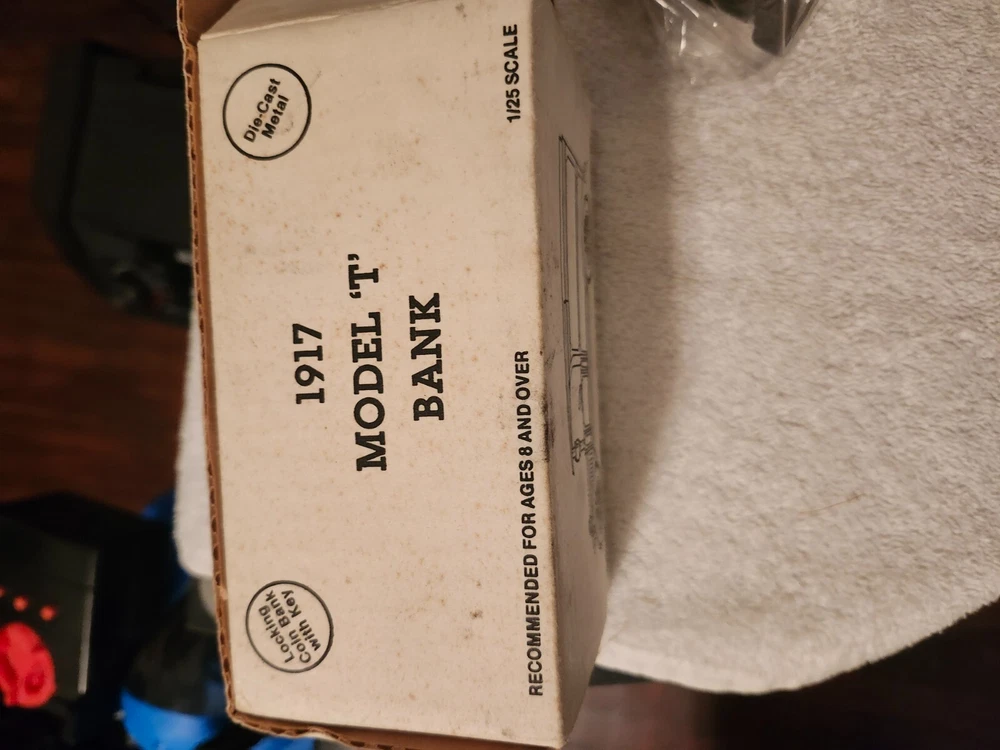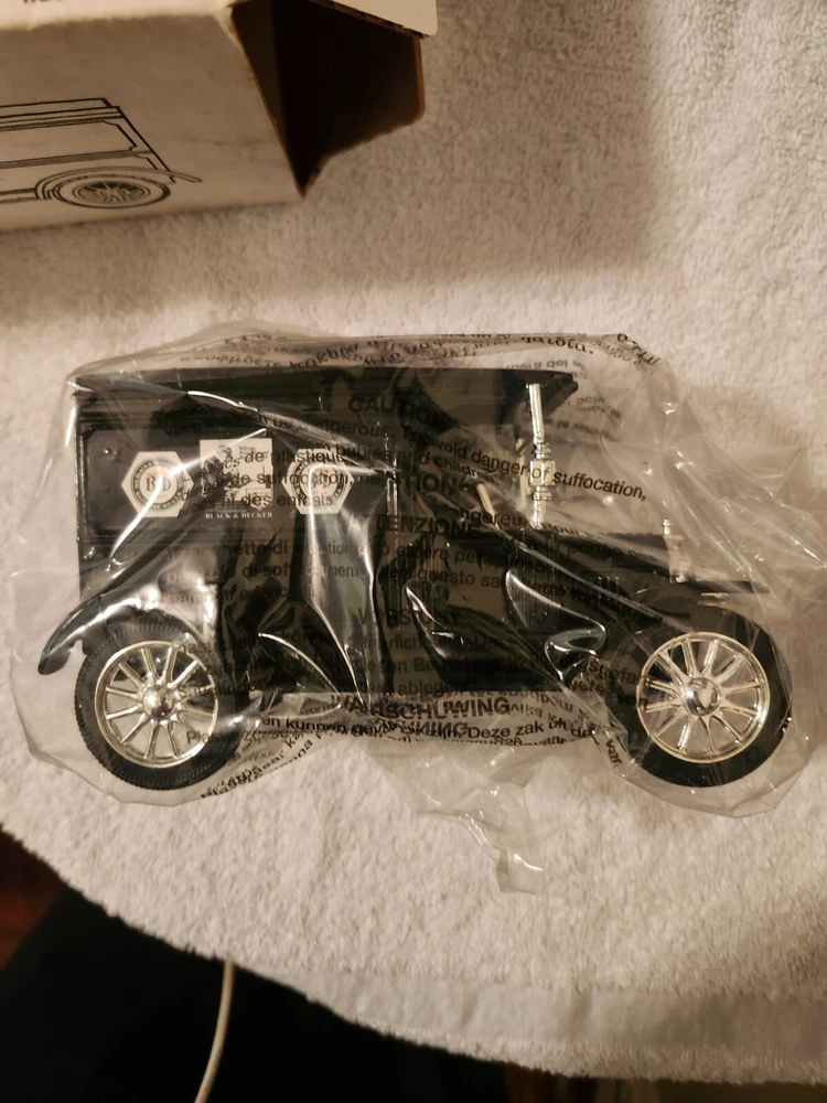 The ERTL 1917 Model "T" Coin Bank in Black & Decker Tools theme is a 1:25 scale die-cast car replica of a Ford Model T from 1917. This collectible piece features a black color scheme and functions as a bank. Manufactured in 1992, it comes in its original packaging, making it a new-in-box item for collectors and enthusiasts.