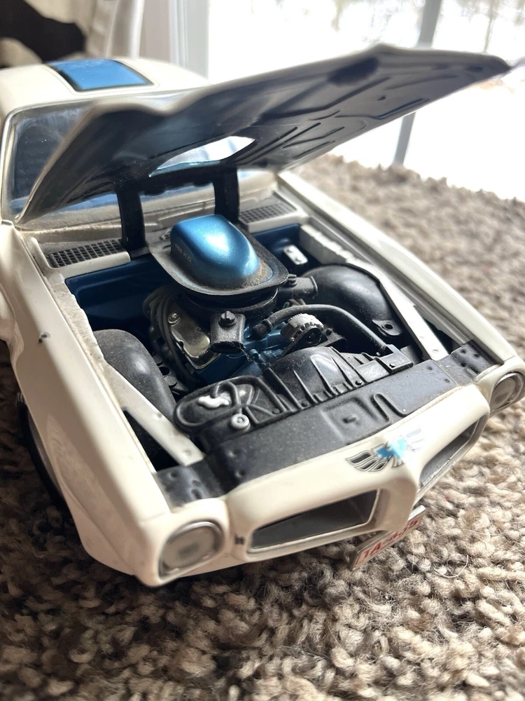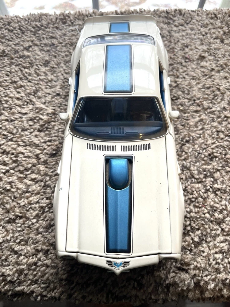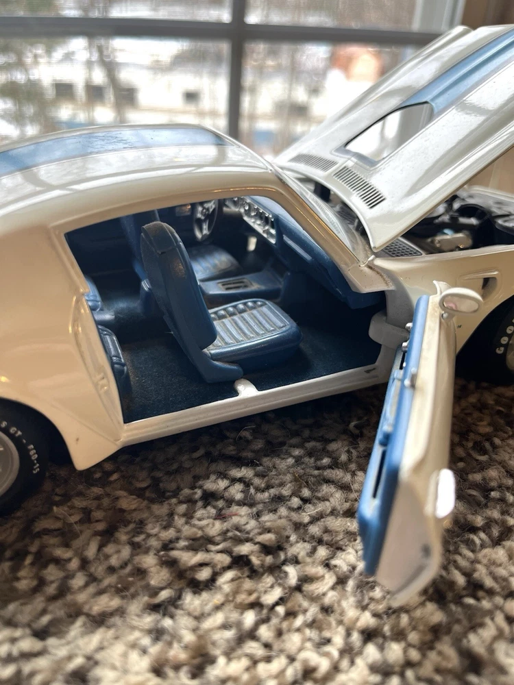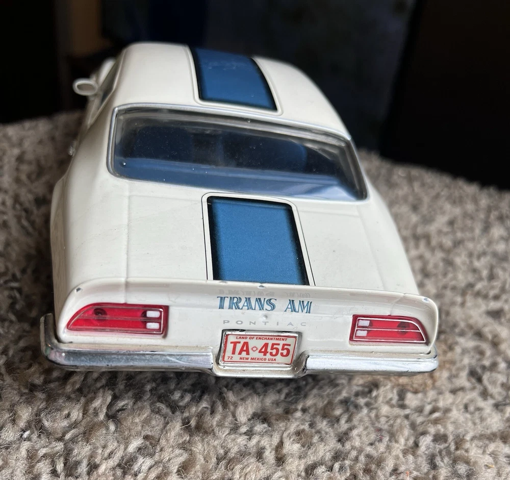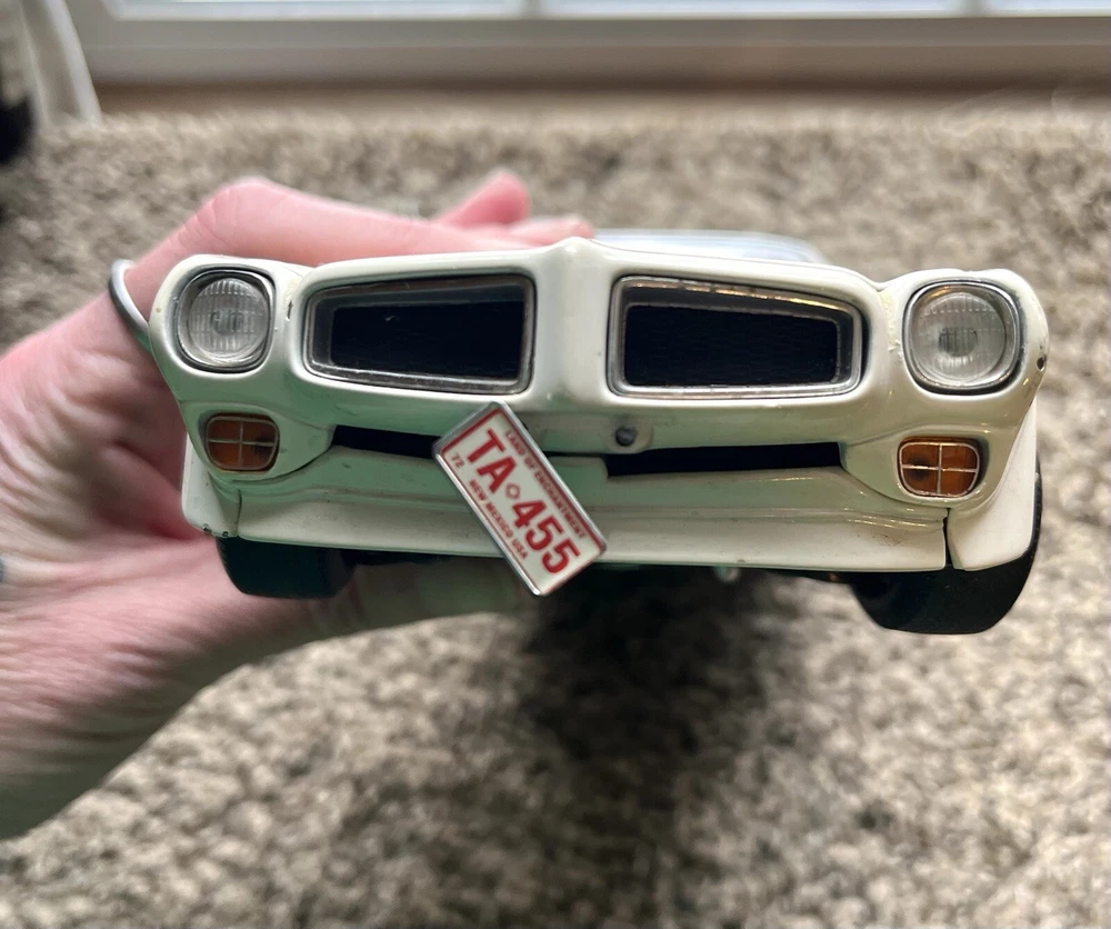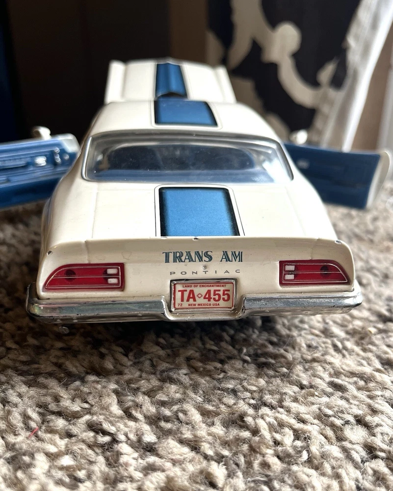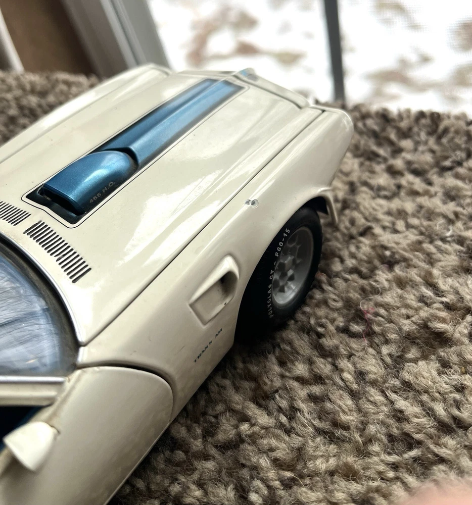 ERTL 1/18 1972 Pontiac Trans Am Die Cast 455 H O In original condition has nicks and scratches in the paint and it HAS NOT been cleaned. Please note from photos that one of the front license plate posts is broken and the shifter has been broken off. All the doors work the hood opens as it should and the steering wheel turns the front wheels as intended. NO BOX INCLUDED