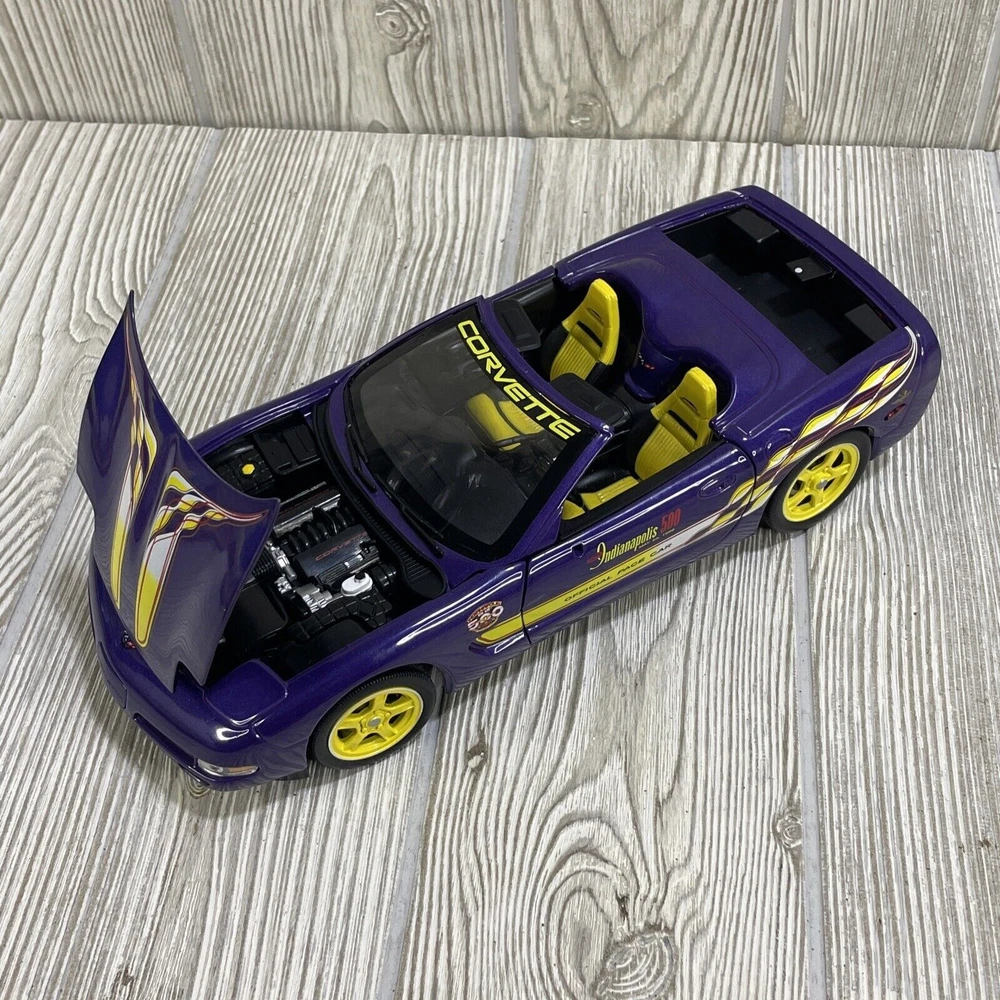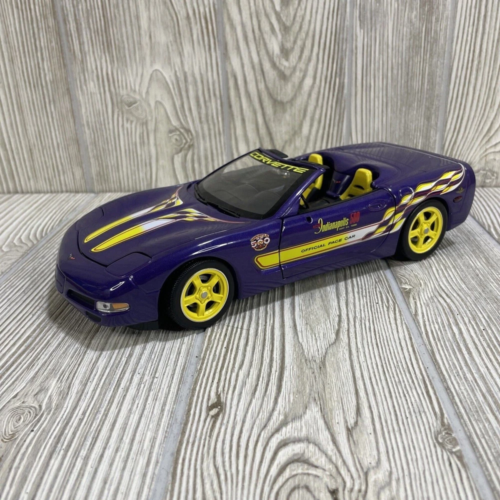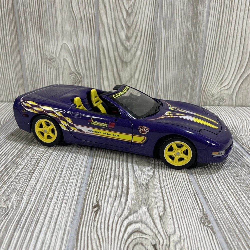 For sale is a limited edition 1:18 scale diecast model car produced by Ertl under the American Muscle series. Chevrolet Corvette. 1998 Indy 500 race pace car. Purple in color. Diecast. Good condition, minor wear consistent with age and use. Missing driver and passenger side mirrors. Trunk is loose, but sits in place very well. See photos.