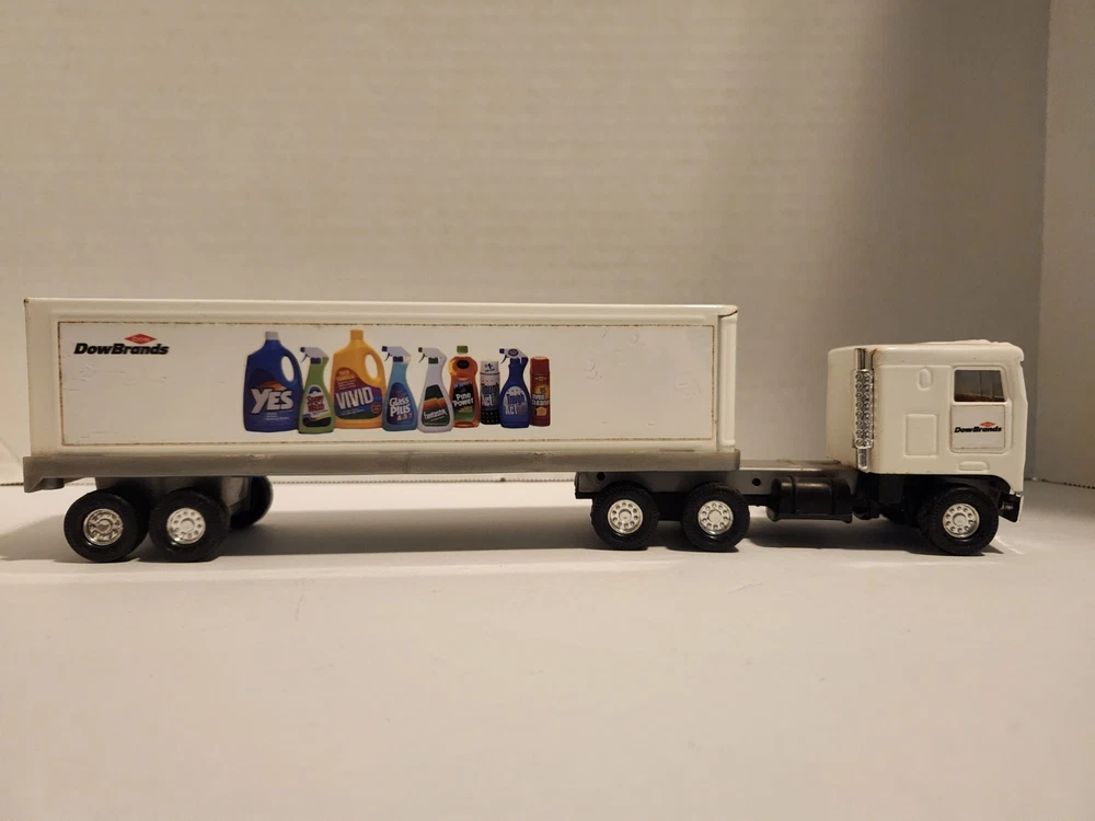 The ERTL #9923 1:48 Kenworth K100 Dow Brands Semi Truck & Trailer is a vintage diecast toy vehicle made of metal in the United States. The model features a white Kenworth K100 truck with the Dow Brands logo on the trailer, making it an advertising specimen. This 1:48 scale toy is suitable for children aged 4-11 years, appealing to both boys and girls who enjoy playing with trucks and trailers in their toy collection.