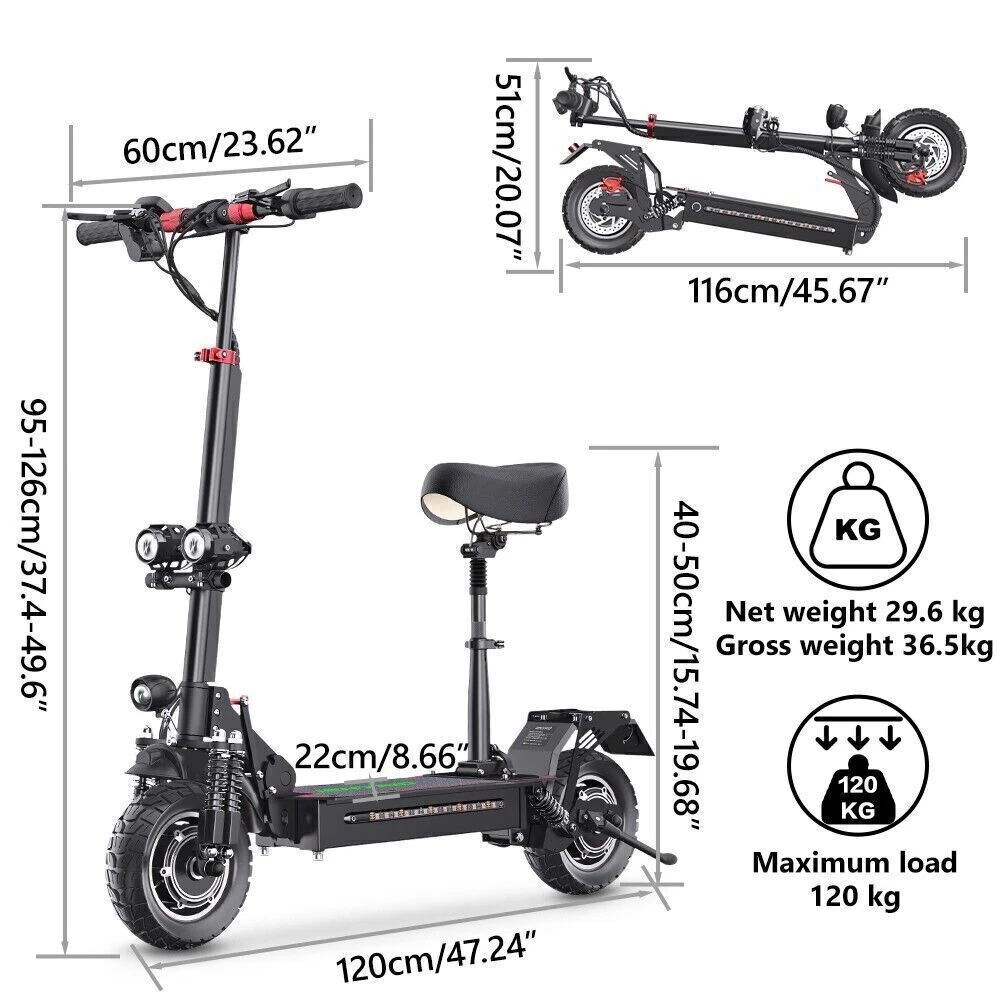 2000W Adults Electric Scooters Dual Motors Drive 48V Commute Off Road E-Scooter 2023 Upgraded iENYRID Electric Scooter ES10 Foldable Electric Scooter comes with a 960Wh (48V 20Ah) battery assisting 25-38 miles cruising range. ES10 becomes an excellent choice for high-quality and comfortable riding. It is suitable for commuting to work, shopping in supermarkets, mountain cross-country and traveling. Powerful Motor & Long Lasting Battery ES10 electric scooters f With powerful Dual 1000W Motors, detailed parts, detachable seat and foldable design,, brings faster acceleration and climbing ability to this electric scooter, which can reach 35 mph max and max 30°climbing angle. Comfortable Commuting IENYRID ES10 adult off road electric scooter comes with upgraded 10-inch off-road tires and front and rear dual suspension to ensure max comfort even on bumpy roads. Also, the aviation-grade aluminum frame is stronger and lighter, which makes the scooter much more elegant to look at and handle as well. And it has a max load of 280 lbs. Foldable Electric Scooter Easy to fold and carry, carry it on public transportation or store it in your car to get to wherever you want. Dynamic, Easy storage in car trunks and other compact spaces, occupying little space and suitable for travel and transportation commute. IPX5 Super Waterproof & LED Intelligent Lighting System The waterproof frame and deck are tightly sealed against water, accredited with an IPX5 ingress protection rating painting. The head of the e scooter is equipped with three LED lights with different functions to ensure safe and worry-free riding at night. Specification: Type: Electric Scooter for Adults Model: IE - ES10 Motor: 2000W Battery specification: 48V 20AH Charger specification: Input AC100-240V, output 54.6V 2A Max aviation plug Controller specification: DC48V/36A Charging time: 4-8 hours Drive mode: front and rear wheel dual drive Max Speed: 31MPH Max Range: 38 Miles Max Load: 280 lbs Maximum climbing ability: ≤ 30 ° Tires: 10 in off-road pneumatic tires Frame Material: aluminum alloy Braking method (front/rear): mechanical braking Front shock absorber: Yes Rear shock absorber: Yes Front headlights: integrated with horn Tail lights: Yes Edge light: Yes Brake lights: Yes Net Weight: 66 lb Front and rear tire pressure: 50 ± 10psi Product Size (L x H x W): 47.24 x 49.6 x 23.62 in (unfolded), 45.67 x 20 x 23.62 inch (folded) Package Contents: 1 x Charger 1 x User Manual 1 x Electric scooter Warning: It is illegal to ride electric scooters on public roads (except under very specific circumstances), pavements or cycle paths. They are intended only for use on private land with the owner’s permission