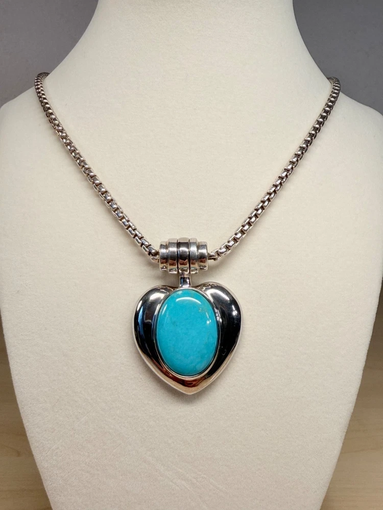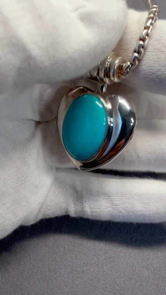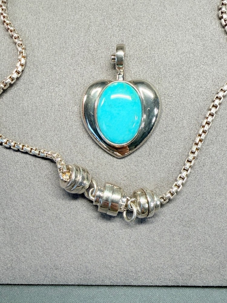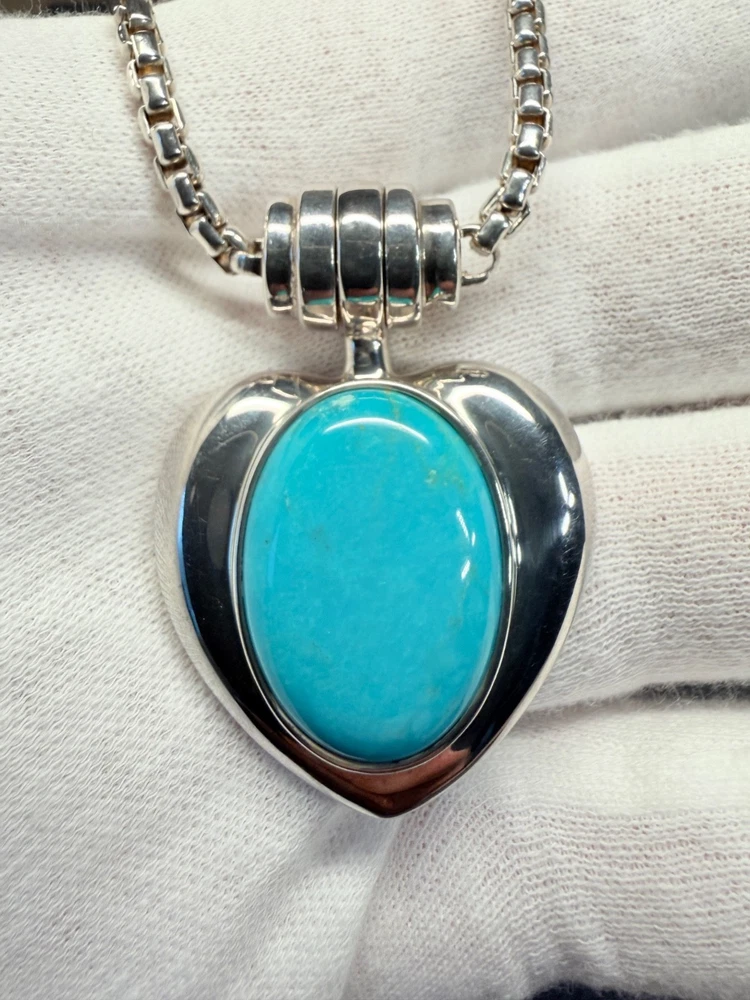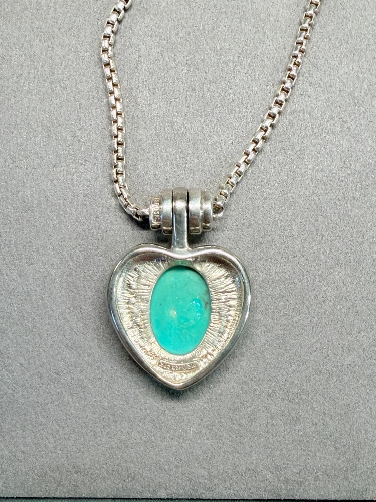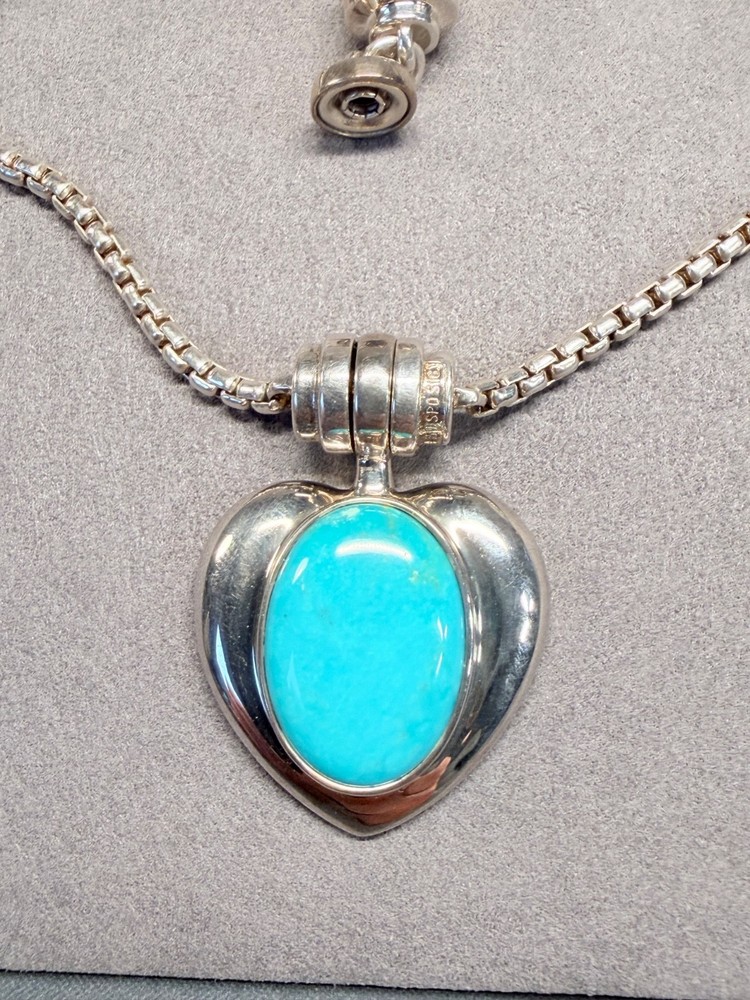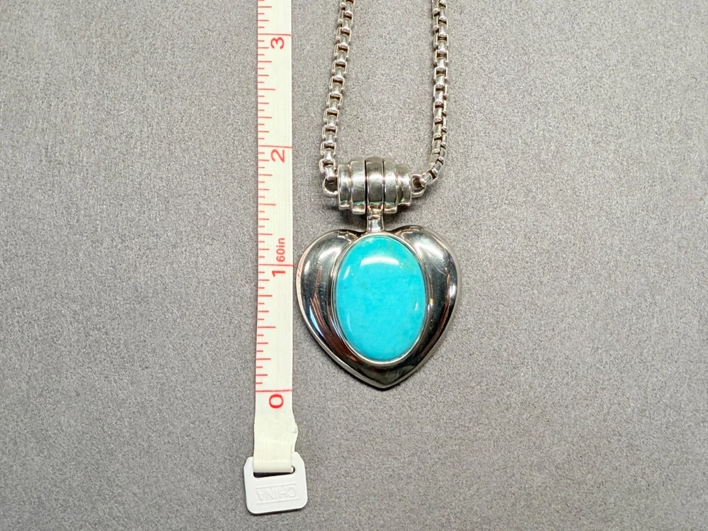 - ESPO Joseph Esposito Sterling Silver Turquoise Heart Snap Pendant Necklace 24in - **INCLUDES CHAIN SNAP TO WEAR CHAIN ALONE** EXCELLENT PREOWNED CONDITION - ITEM SHIPS OUT IMMEDIATELY - - REPUTABLE SELLER - CHECK MY FEEDBACK! - Base metal: 925 Sterling Silver Manufactured: ESPO SIG - Joseph Esposito Aprx. Weight: 77.76 grams Aprx Pendant Size: 1-3/4 inches X 1-1/4 inches Aprx Chain Length: 24 inches Aprx Chain Width: 3mm Stones: x1 Turquoise **ITEM HAS BEEN INSPECTED BY LICENSED GEMOLOGIST TO ENSURE ACCURATE DETAILS & QUALITY** Piece is in very good condition. Please reference pictures for description. (MANY PHOTOS w/ DIFFERENT LIGHT SETTINGS) Comes with case. Most items are sent via USPS ground advantage w/ insurance unless another option is chosen. All items exceeding $749 will require signature. Handling typically takes 1-3 days. (some items will have handling charges to help cover parcel insurance) **IF YOU REQUIRE QUICK TURNAROUND PLEASE SELECT AN EXPEDITED SHIPPING** CHECK OUT MY OTHER FINE JEWELRY LISTINGS!!! >>> https://www.ebay.com/str/alwayforward/Jewelry-Watches/_i.html?_sacat=281 Notes: J02-315