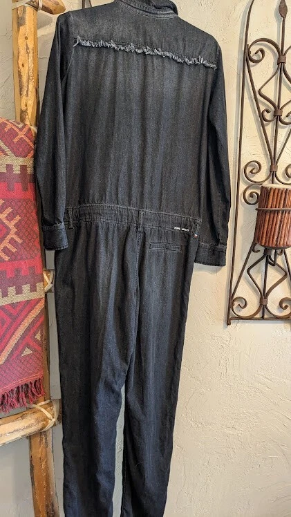 Lots of details on this jumpsuit--snap and tie at waist, button front, fringe detail, large front pockets. No size tag, but adjustable waist measures 35 in, pit to pit is 39.