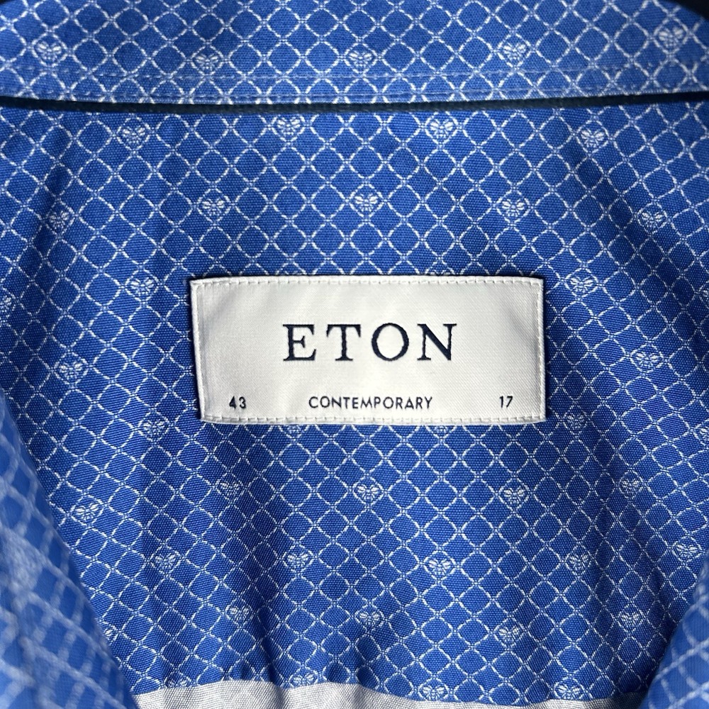 The ETON Contemporary Luxury Cotton Long Sleeve Button Up Dress Shirt in XL size is a sophisticated and stylish option for men. Made from high-quality cotton material, this shirt features a geometric pattern in blue color, making it suitable for casual, formal, and business occasions. The shirt has a collared neckline with a spread collar style and barrel cuff top cuff style, adding a touch of classic and designer flair. With its regular fit and easy care instructions, this shirt is a versatile and timeless addition to any man's wardrobe.