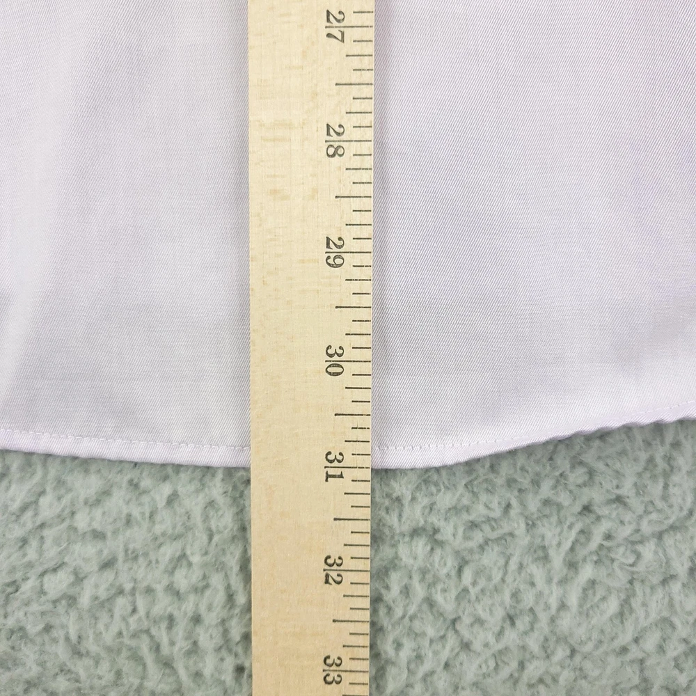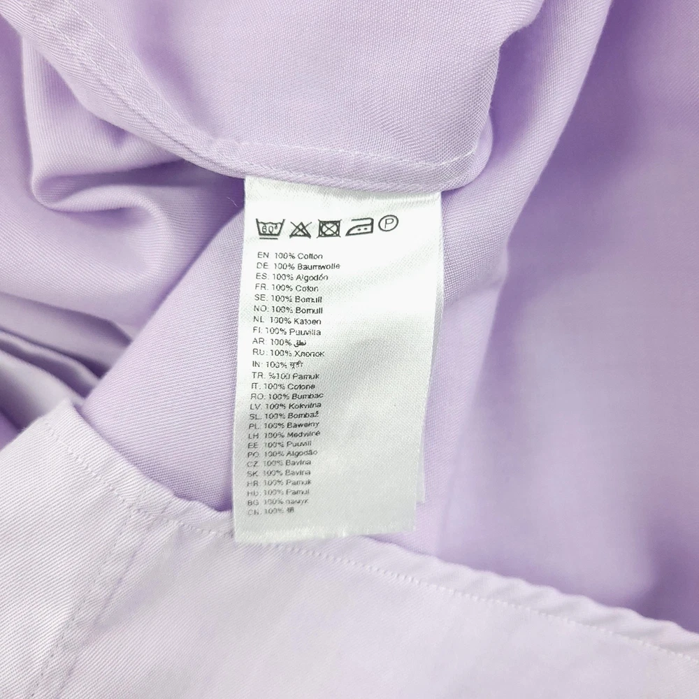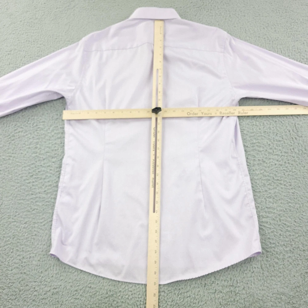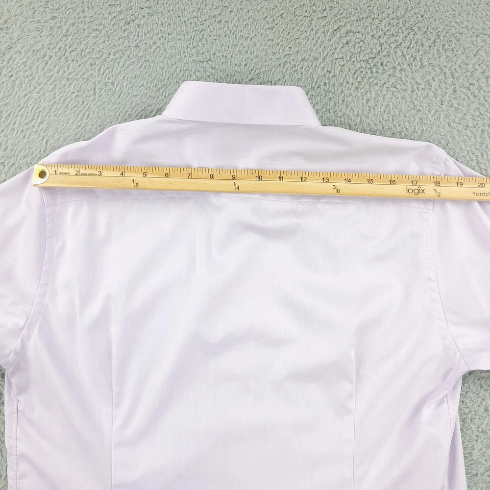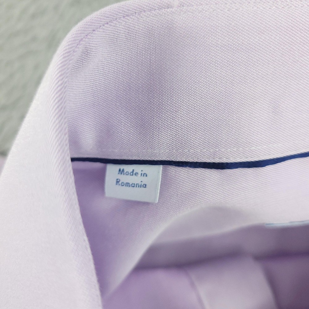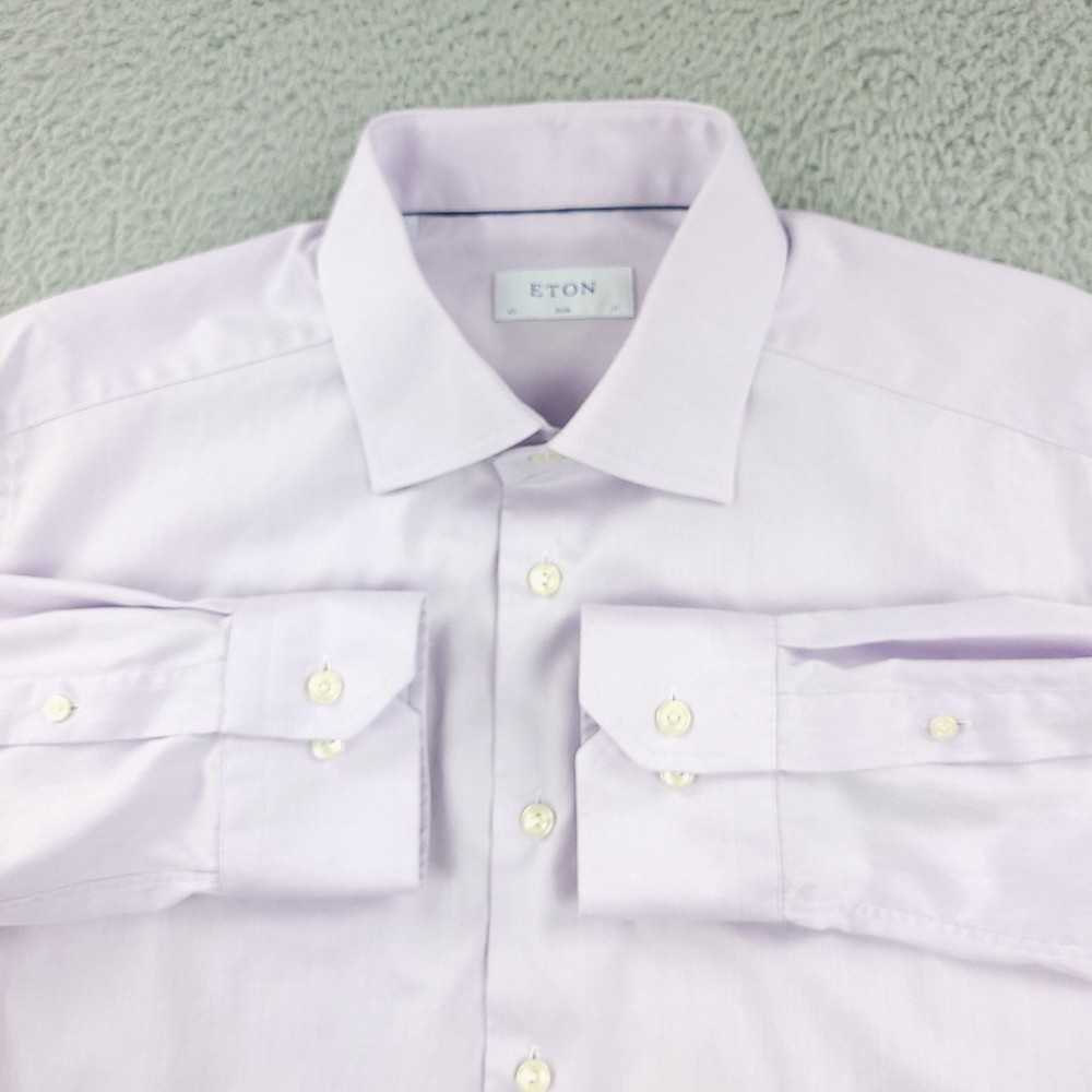 Brand: ETON Item: Mens long sleeve dress shirt with button front and barrel cuffs. Color: Light purple/lavender. Fit: Slim fit tailoring. Size on tag: 43 / 17 (neck 17, approximate EU 43). Material: 100% cotton (per care tag). Country of origin: Made in Romania. Design details: Classic spread collar, front button closure, double-button barrel cuffs, curved hem, smooth solid fabric suitable for business or formal wear. Washed and dried with Fragrance Free Detergent & Dryer Sheets. Measurements are included in the photos, compare measurements with your item to ensure proper fit. (Measurements are done with the item lying flat). I ship next business day and all items include tracking. Items are added daily to my store Visit My Store Buy More & Save! Combined shipping for US customers - $1.99 for each additional item (Add items to shopping cart and discounts will automatically calculate during checkout)