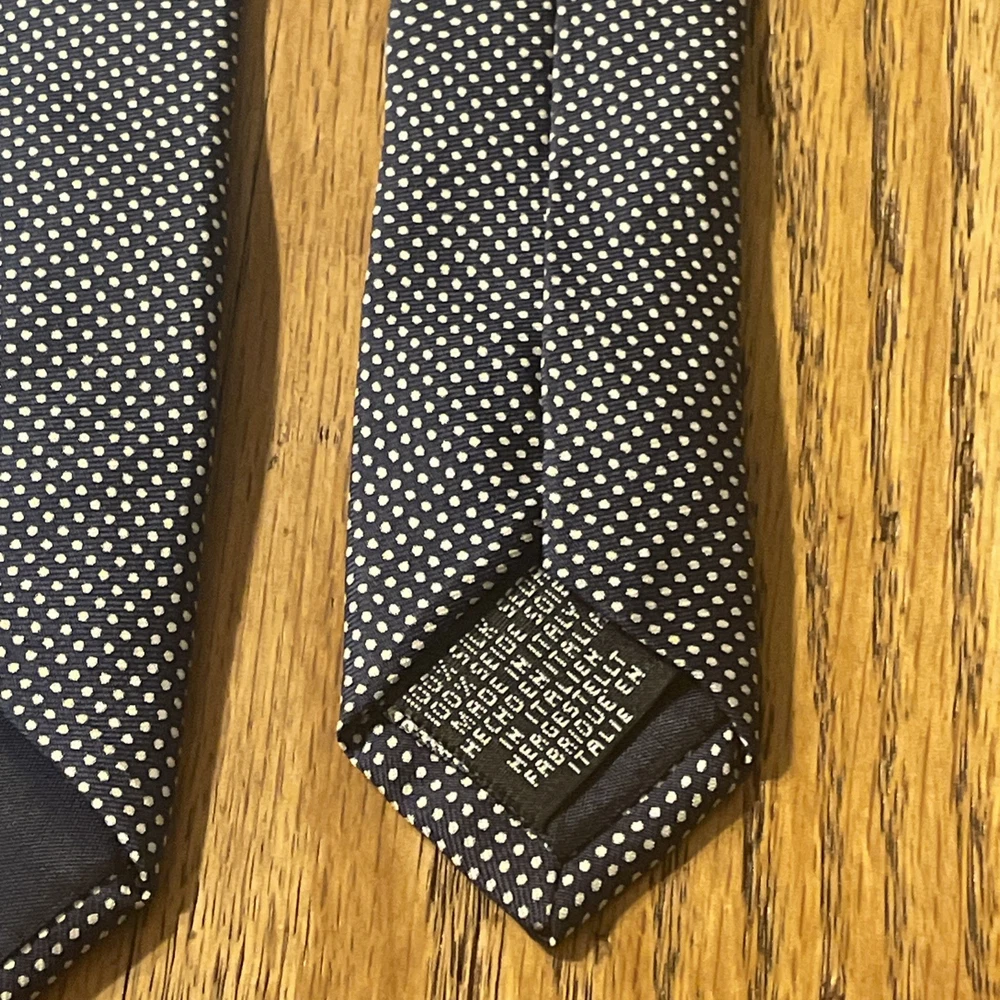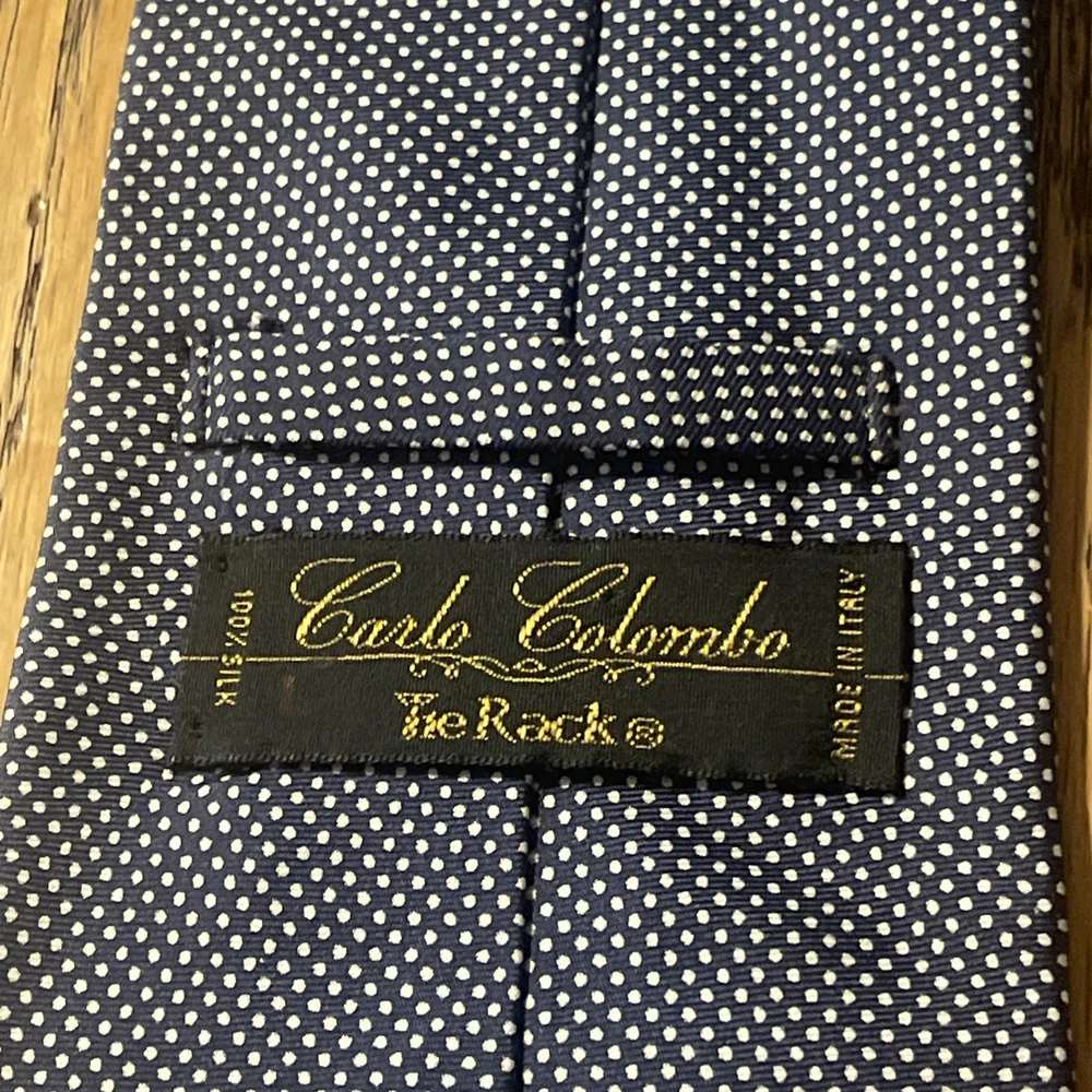 The EUC Carlo Colombo For Tie Rack Silk Fine Dot Pattern Necktie is a designer tie made in Italy from 100% silk. Featuring a classic width and a preppy style, this multicolor tie is crafted with a satin fabric and a fine dot pattern, making it a stylish addition to any man's accessory collection. The Carlo Colombo / Tie Rack brand ensures quality and sophistication in this timeless piece.