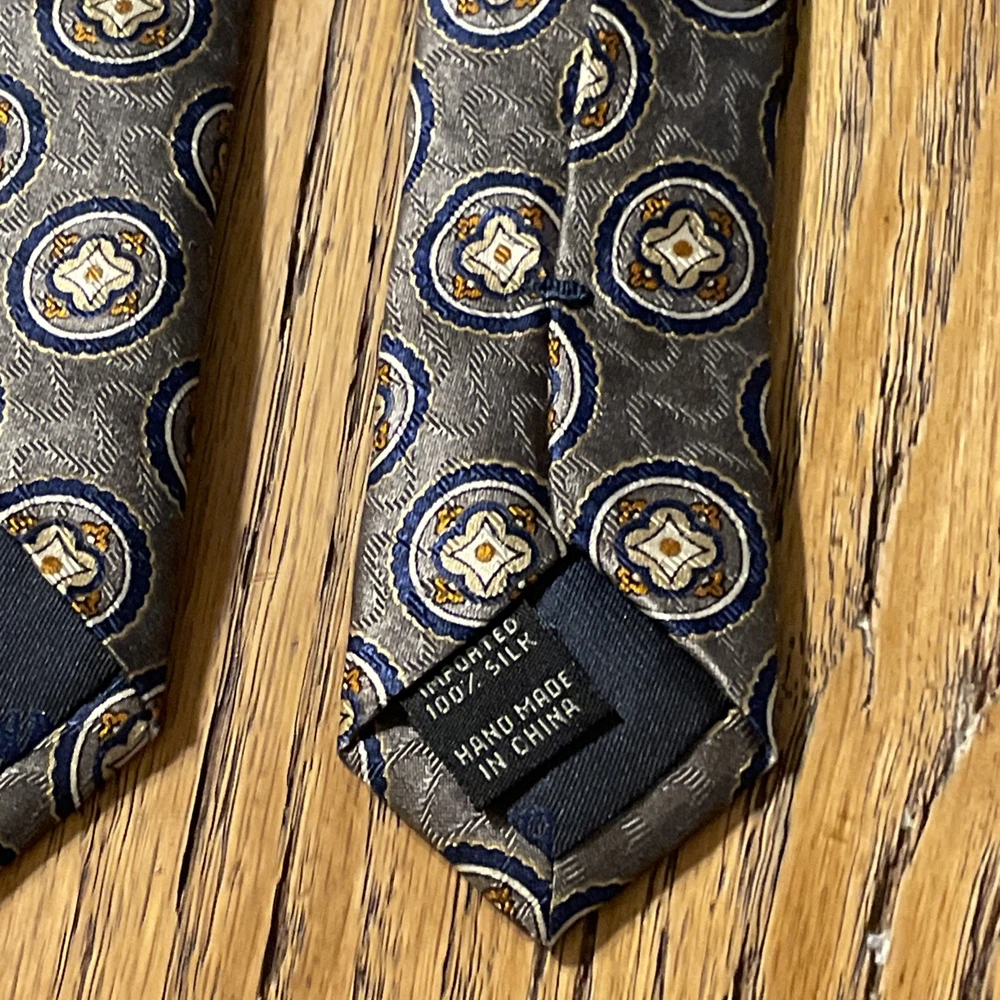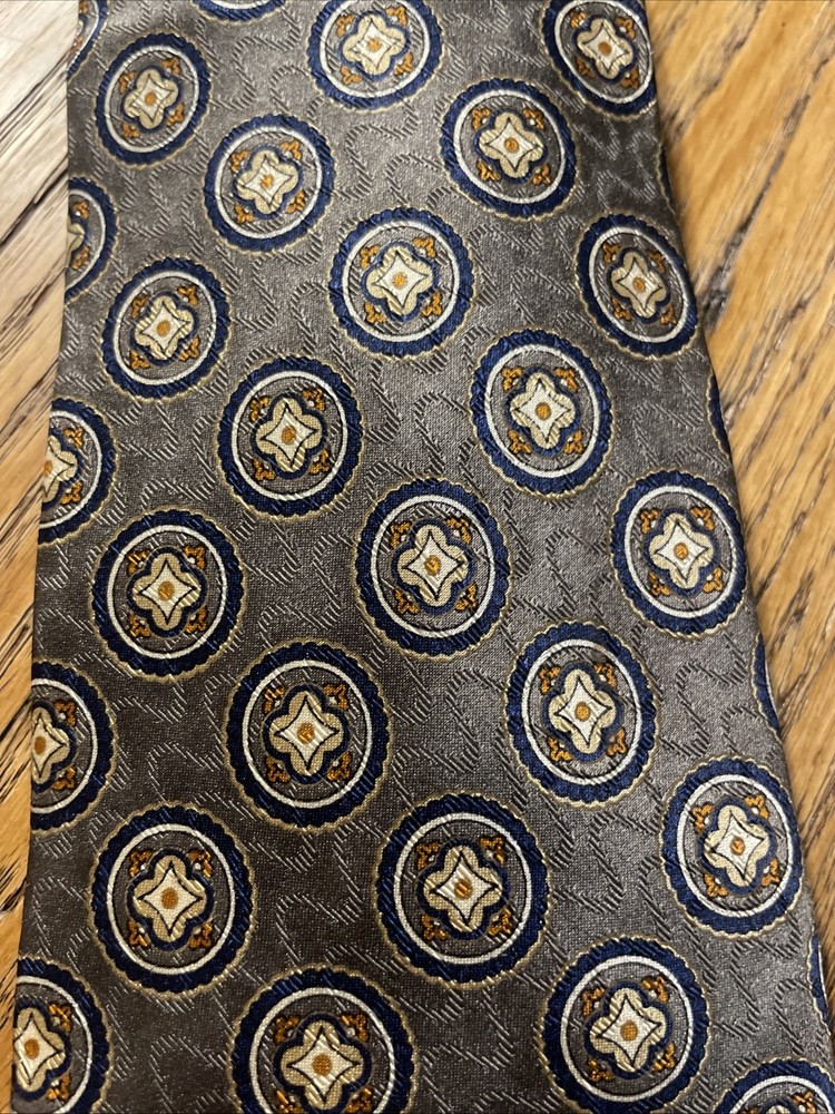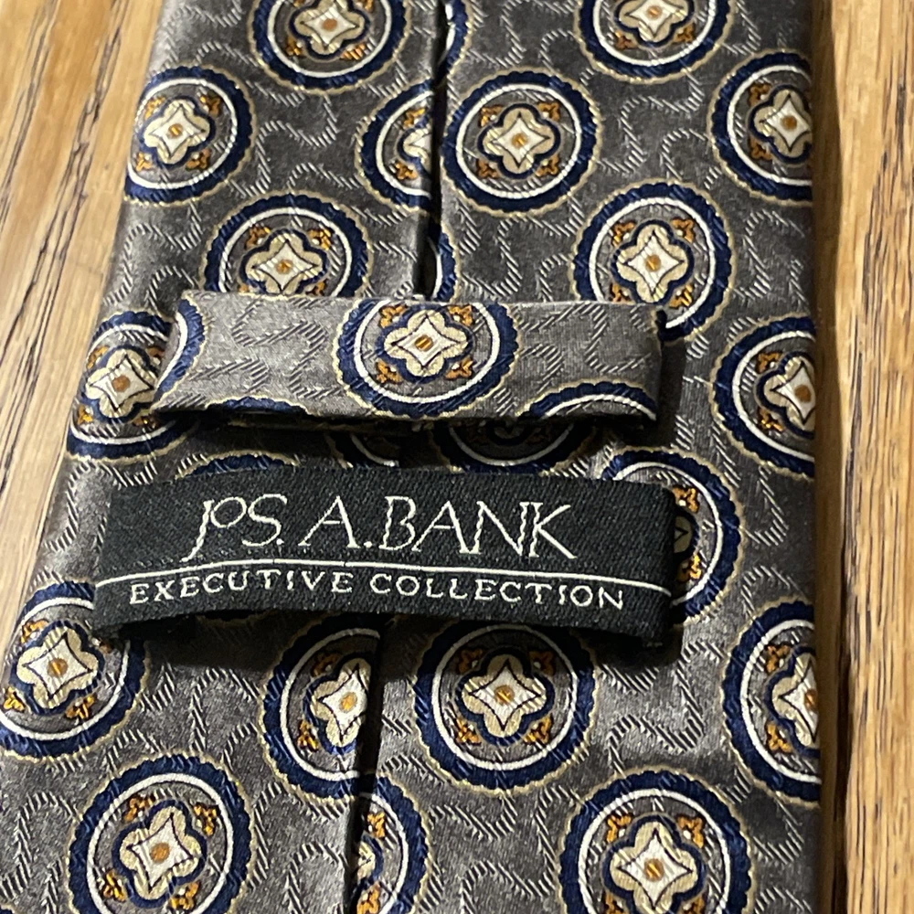 The EUC Jos. A. Bank Executive Collection Silk Medallions Tie is a high-quality designer necktie made from 100% silk satin. This classic tie features a multicolor medallion pattern, perfect for adding a touch of preppy style to any outfit. Handmade with attention to detail, this vintage piece is sure to elevate any man's formal look with its sophisticated design and excellent craftsmanship.