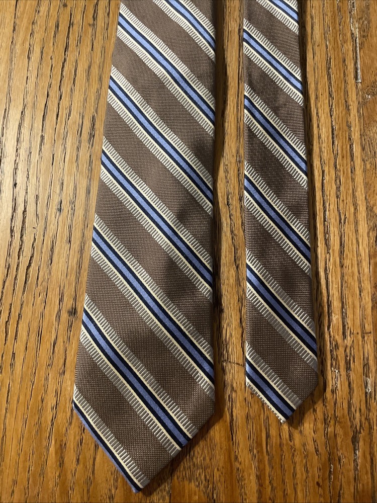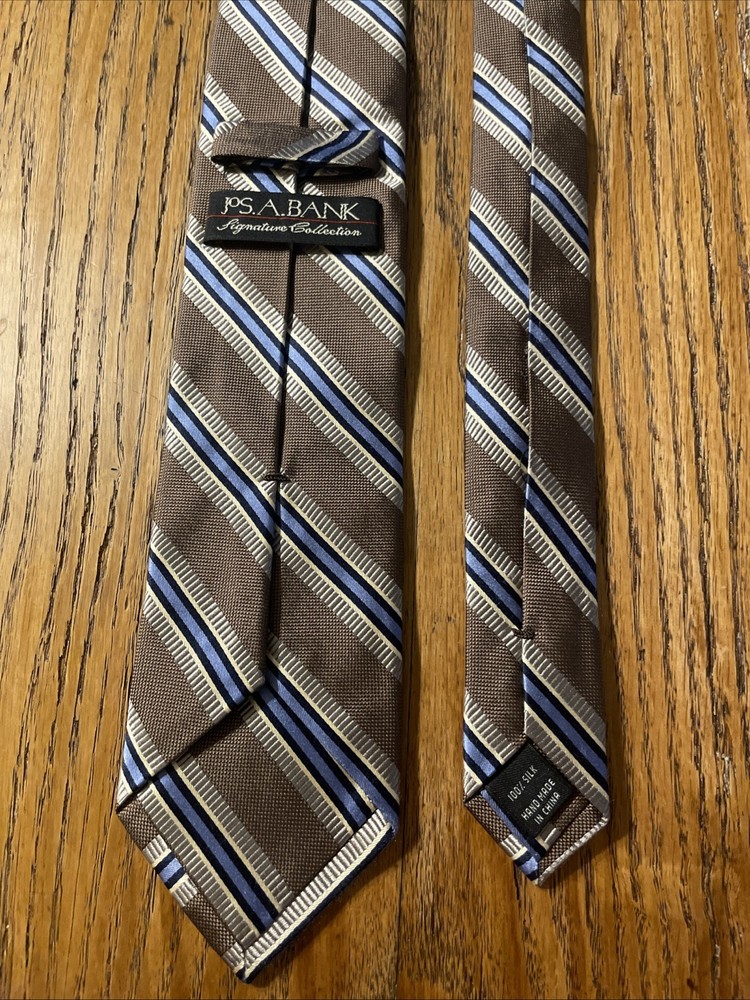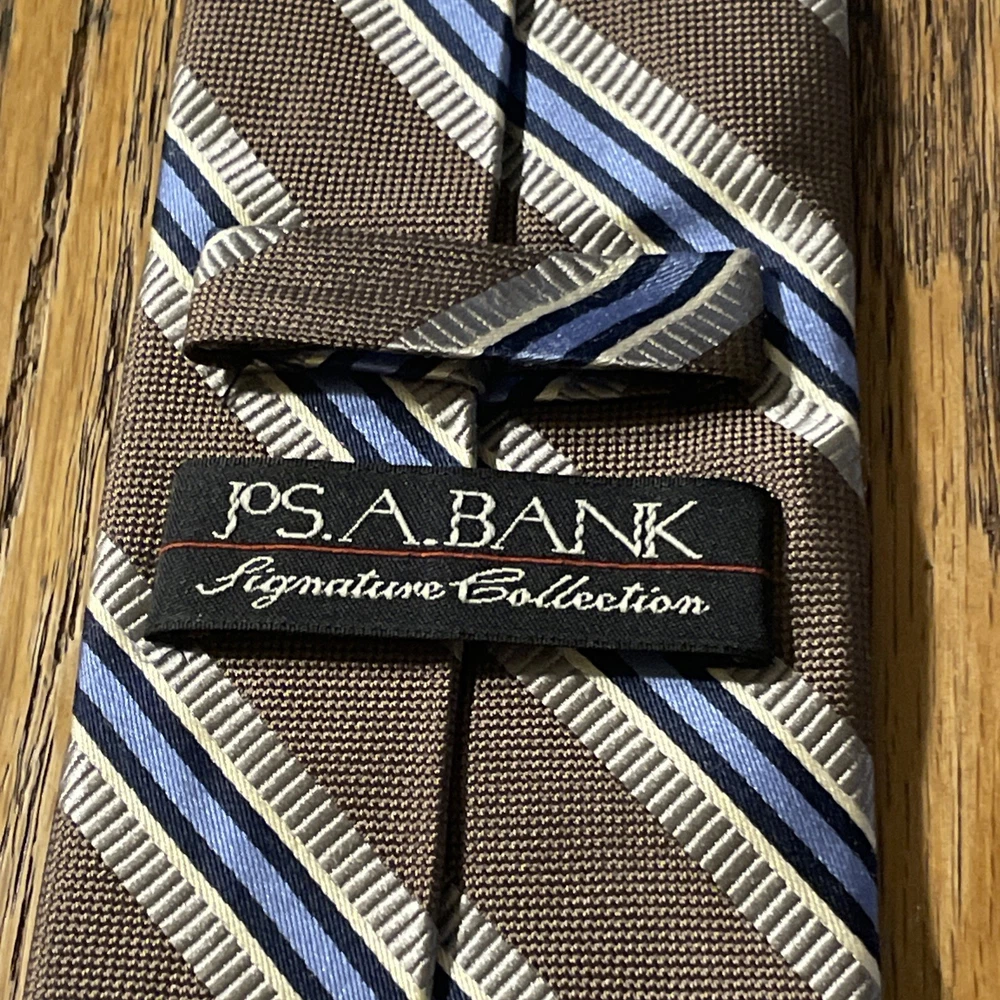 The EUC Jos. A. Bank Signature Collection Thick Silk Striped Tie is a luxurious and high-quality designer accessory for men. Made from 100% silk with a woven fabric type, this multicolor tie exudes a preppy style perfect for formal occasions. The classic width and striped pattern add a touch of sophistication to any outfit, making it a timeless choice for the discerning gentleman.
