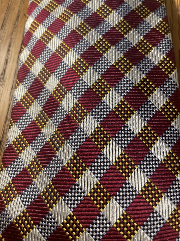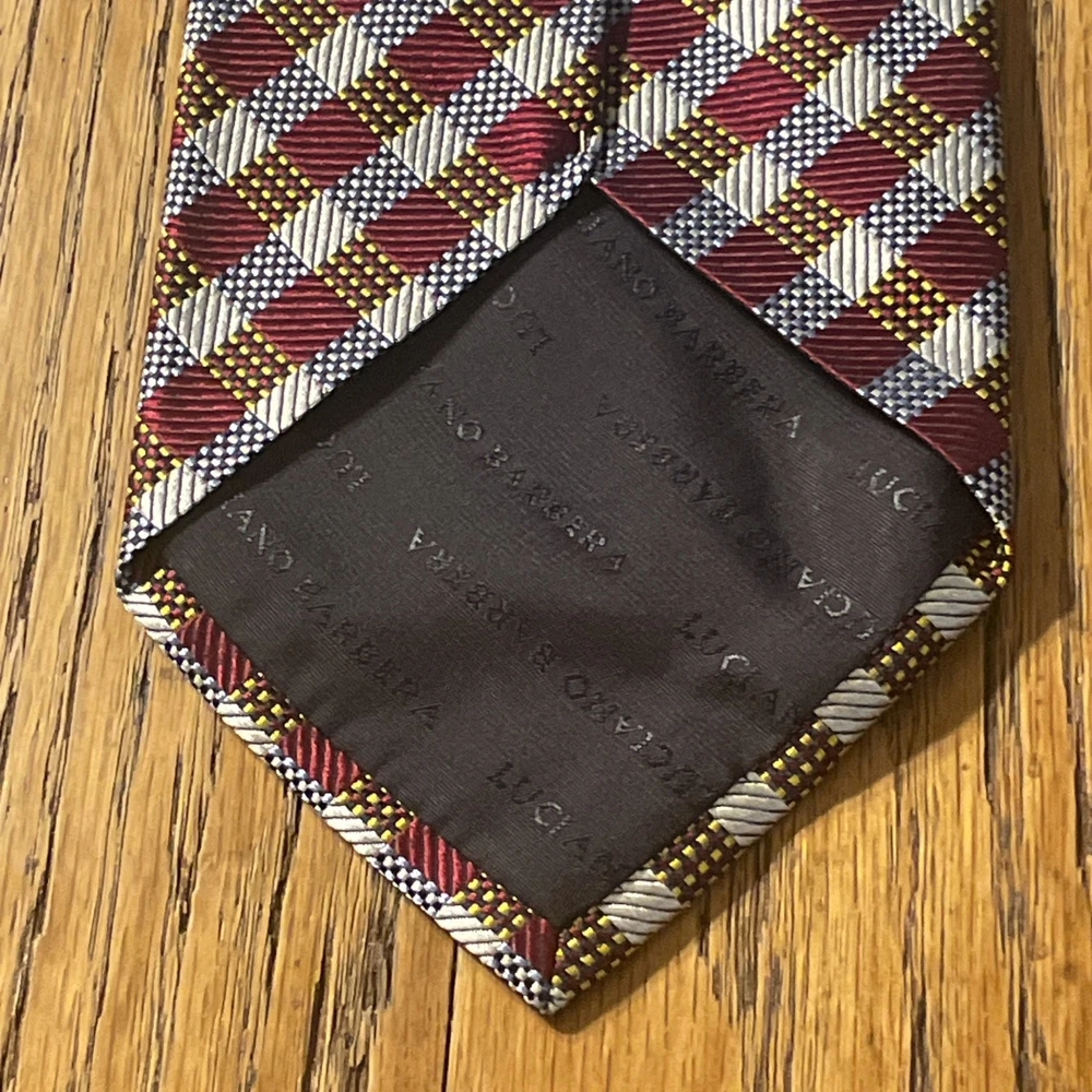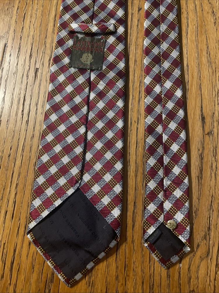 The EUC Luciano Barbera Shiny Thick Silk Geometric Tie is a luxurious men's accessory crafted in Italy. Made from 100% silk fabric, this designer tie features a classic width and a vibrant multicolor geometric pattern, perfect for adding a touch of preppy style to any outfit. The intricate woven design and high-quality material make it a timeless and sophisticated choice for any occasion.