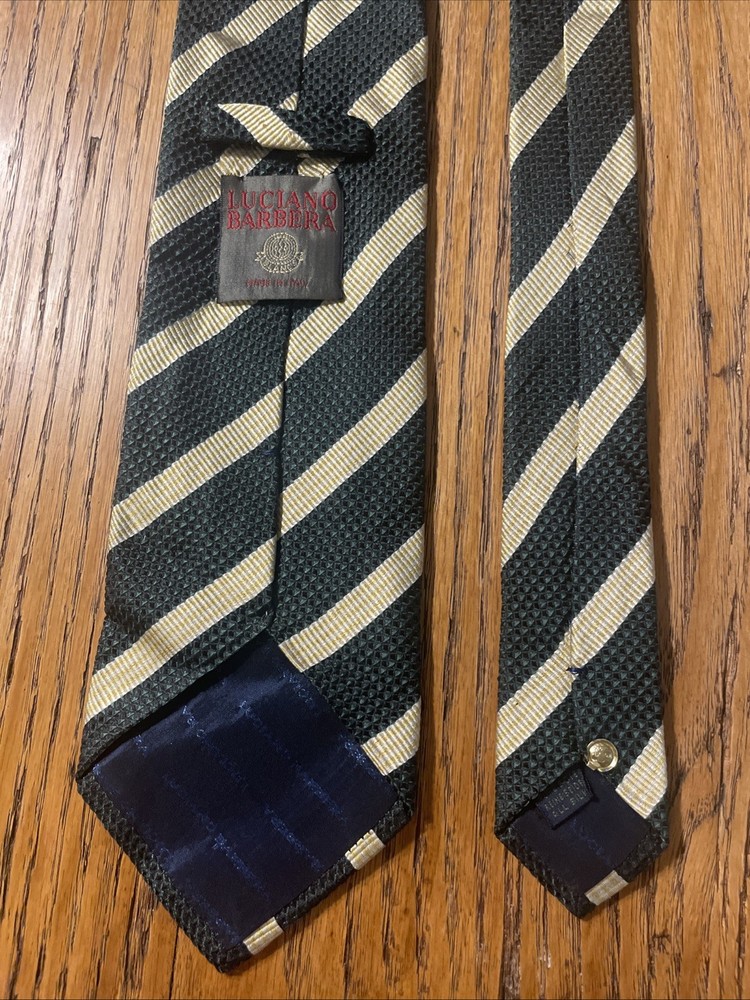 The product is a stylish and luxurious Luciano Barbera striped tie made in Italy. This designer tie is crafted from 100% silk in a classic width, perfect for a preppy and sophisticated look. The multicolor stripes add a touch of elegance to any men's outfit, making it a versatile and high-quality accessory for formal occasions or business events. With its woven fabric and impeccable craftsmanship, this tie exudes a sense of refinement and luxury that is sure to impress.