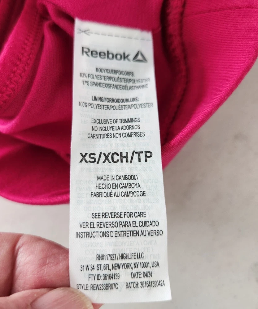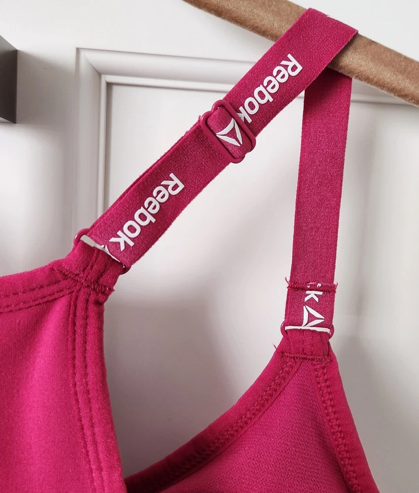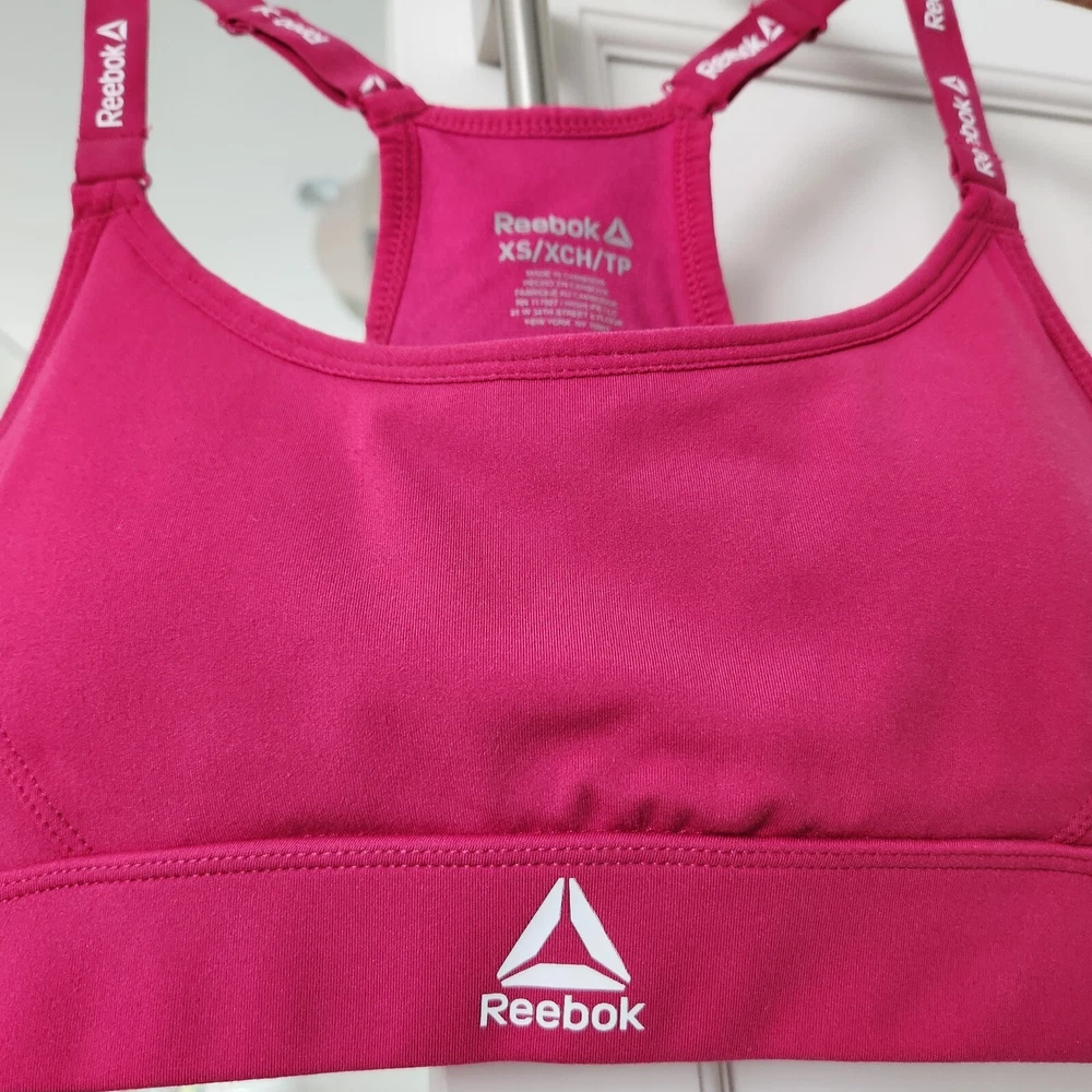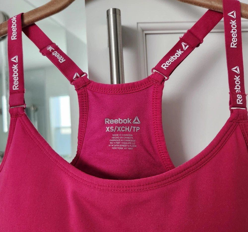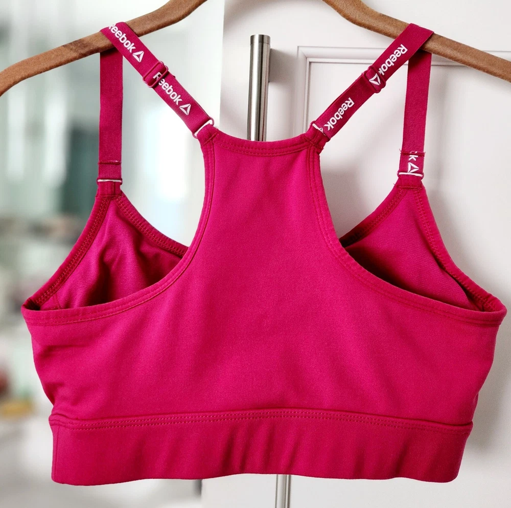 Size Type: Regular Color: Pink Occasion: Activewear Theme: Classic, Colorful, Sports Strap Type: Racerback Features: Padded Cup Size: One Size Closure: Pullover Personalize: No Cup Coverage: Full Performance/Activity: Yoga Accents: adjustable straps Department: Women Material: Polyester Blend Size: XS Underwire Type: Wireless Style: Sports Bra Brand: Reebok Seller Notes: “EXCELLENT condition!” Band Size: XS Pattern: Solid Type: Bra Garment Care: Machine Washable Country/Region of Manufacture: Cambodia Support Level: Medium