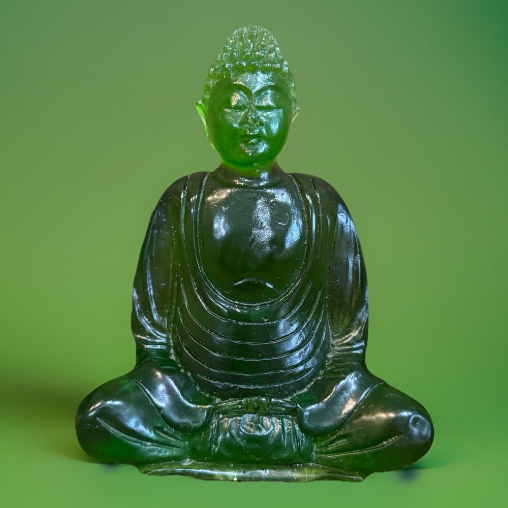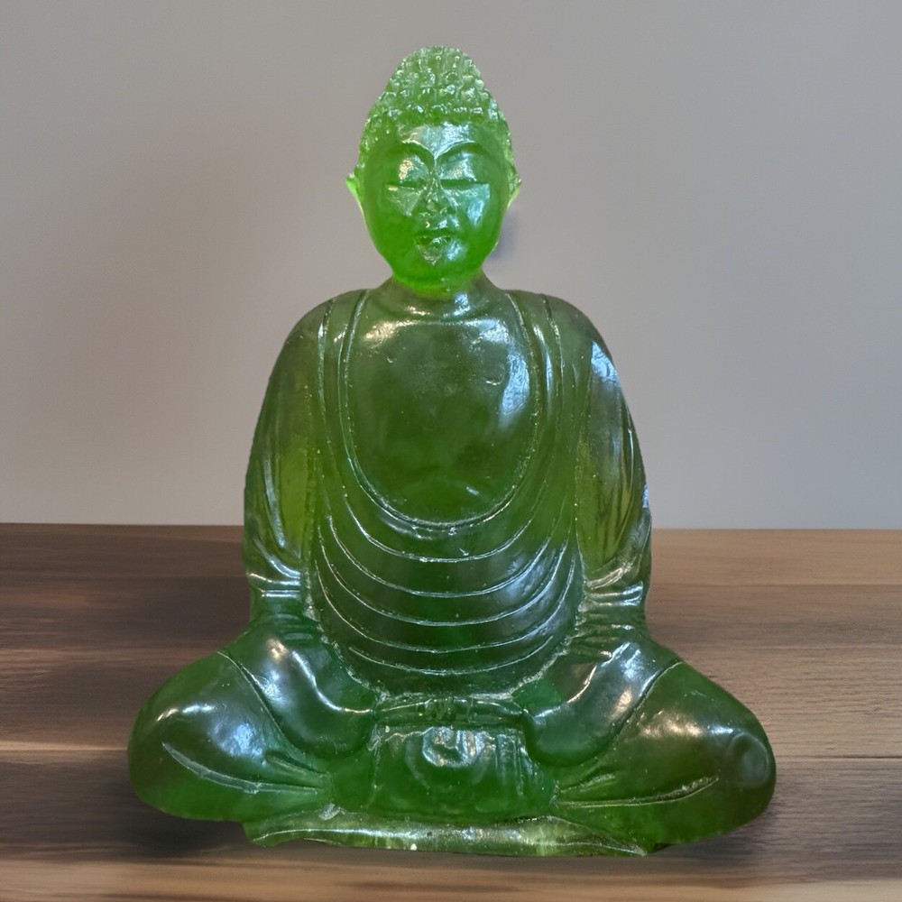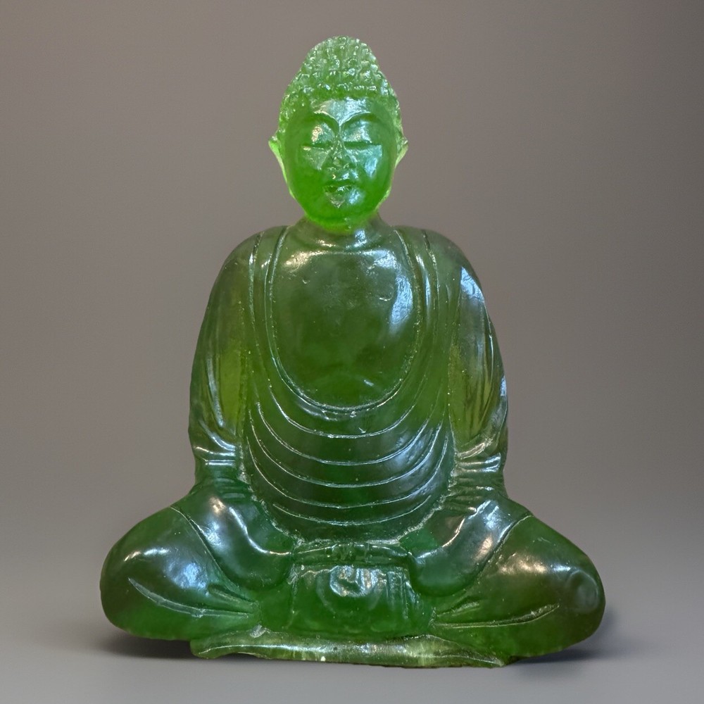 EUC Vintage Sitting Thai Clear Green Resin Buddha 5.5” X 4” Sitting cross legged holding purse. Beautiful clear green color.