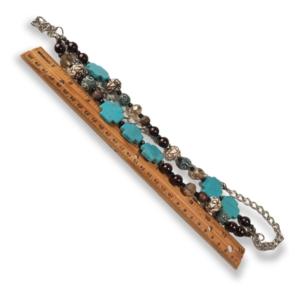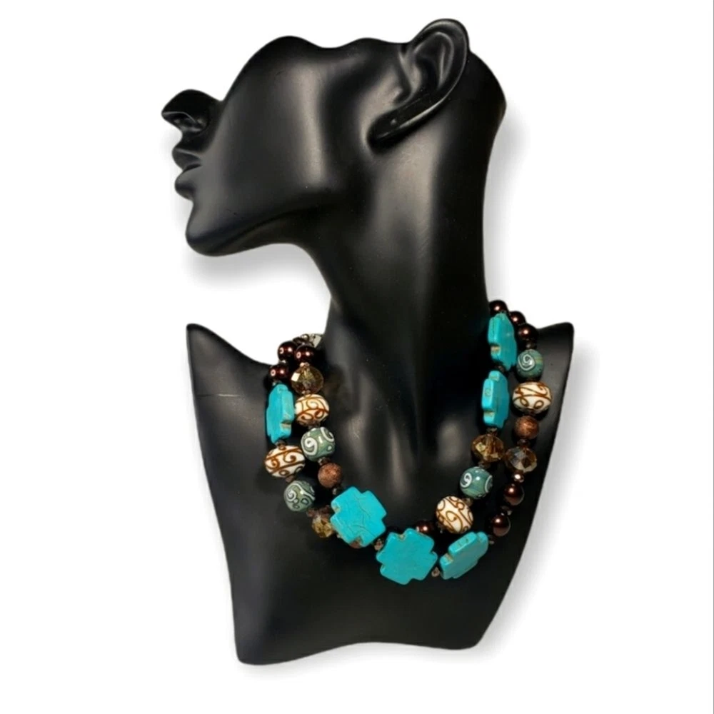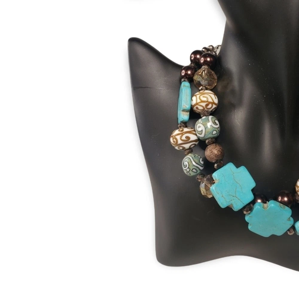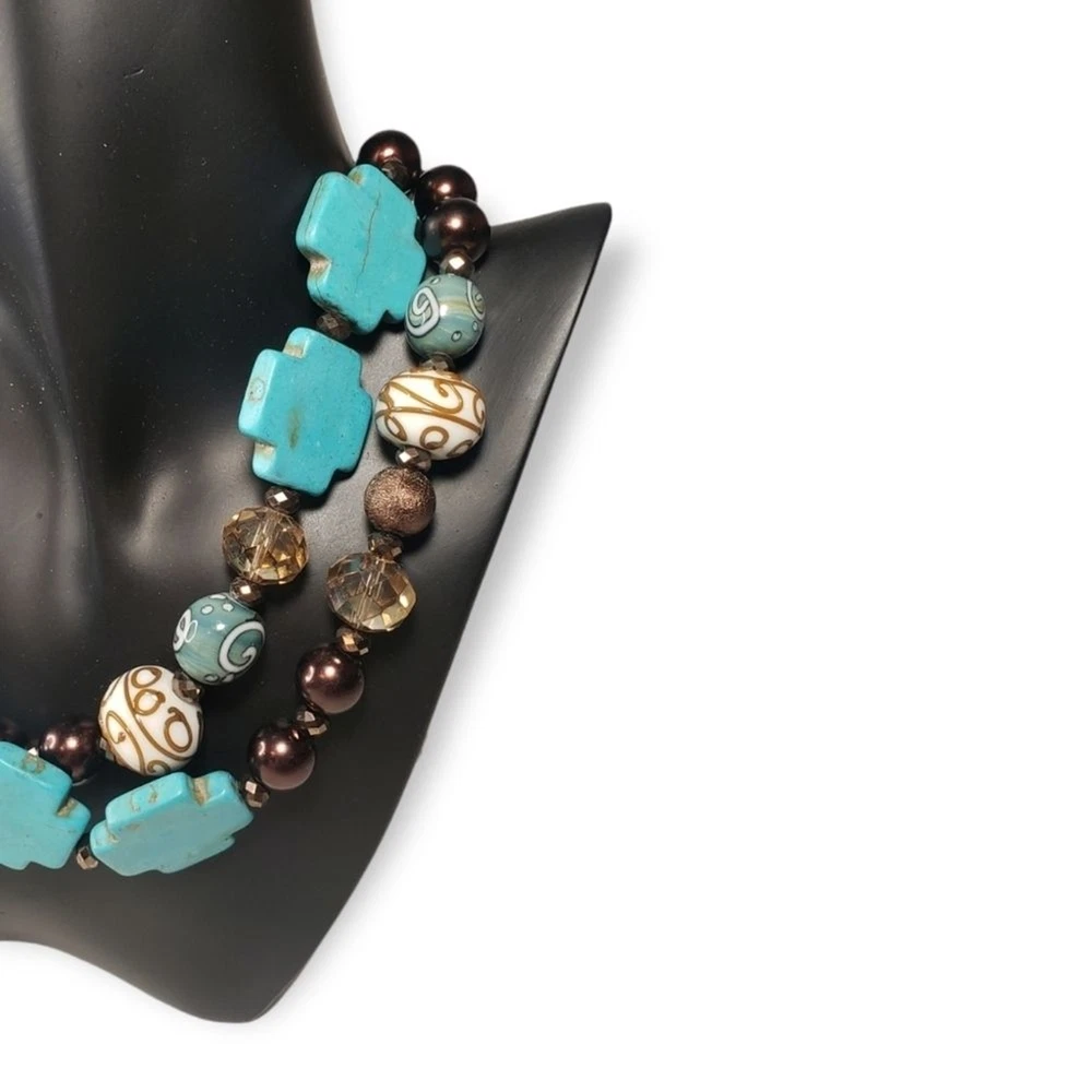With (faux) turquoise crosses, glass wedding cake beads, and shimmering accents - this necklace is as cool as it is glitzy! There are no issues, it's in good shape. the beaded section measures approximately 12" and the chain, extension included, measures another 20".