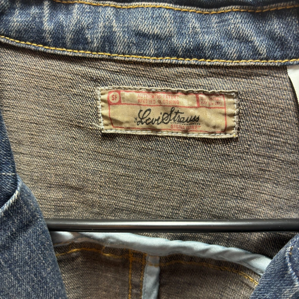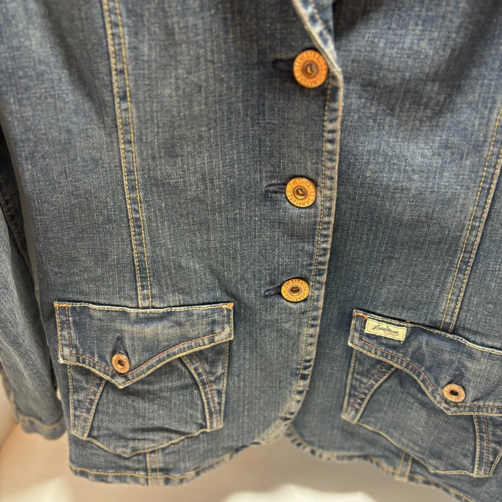 This Levi's Signature Denim Jean Jacket is a must-have for any fashion-forward woman. The jacket features copper buttons, a notch collar, and single-breasted closure. The mid-length coat is made of high-quality cotton denim and is machine washable for easy care. The jacket comes in a beautiful blue color and has long sleeves, making it perfect for winter, fall, and spring seasons. It has pockets for added convenience and is unlined, which makes it ideal for casual occasions. This jacket is a regular fit and is available in size L. Get this Levi's Signature Denim Jean Jacket now and add a touch of style to your wardrobe! Bust measures 40"