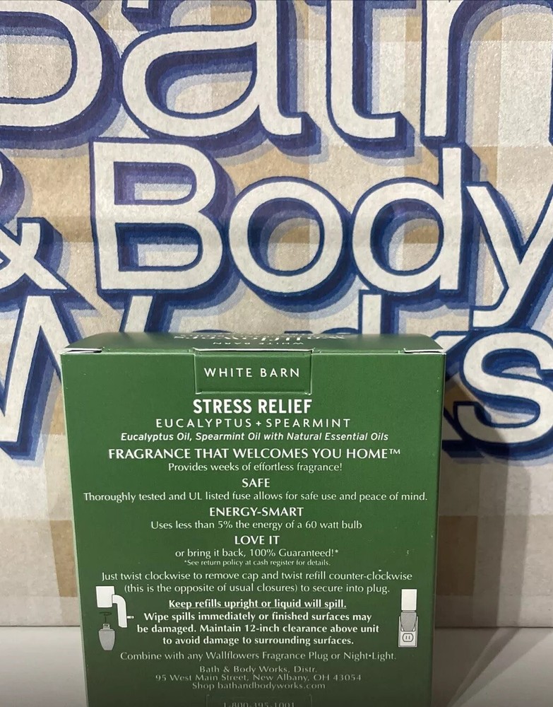 gtin13: 667559269625 Number in Pack: 2 UPC: 667559269625 Material: Glass Installation Area: Wall Type: Refill Smart Home Compatibility: None Size: .8 Features: Deodorizer, Odor Eliminator Scent: Eucalyptus, Spearmint Humidity Control: No Brand: Bath & Body Works Department: Adults Form: Oil Power Source: Wall Plug-In Country/Region of Manufacture: United States Labels & Certifications: N/A Item Weight: 2 x 0.8 fl oz