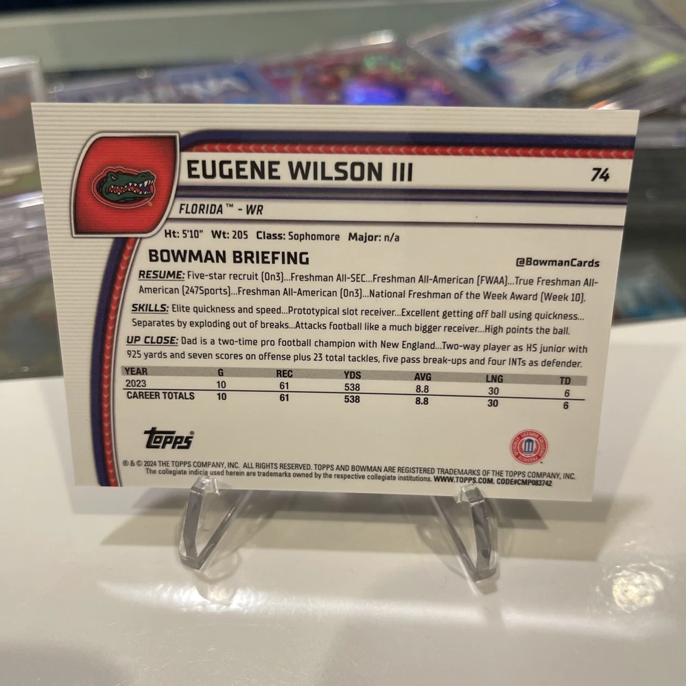 Elevate your collection with the EUGENE WILSON III 2024 Bowman Chrome U Color Match Blue Refractor, limited to just 199 prints. This trading card is a standout piece, featuring the Florida Gators' standout player in a highly sought-after rookie card. The serial numbered card ensures uniqueness and exclusivity for collectors. Crafted by Topps, a trusted name in sports memorabilia, this card belongs to the 2024 Bowman series and boasts the True Blue Refractor parallel, adding a layer of brilliance and rarity. It's a must-have for fans of NCAA football and especially for those who follow the athletic prowess of Eugene Wilson. This card is a tangible piece of football history in the making.