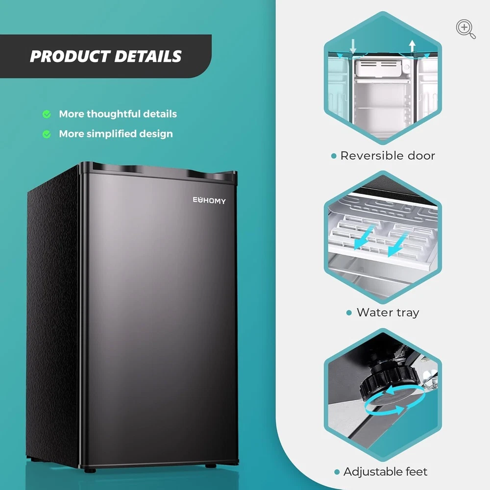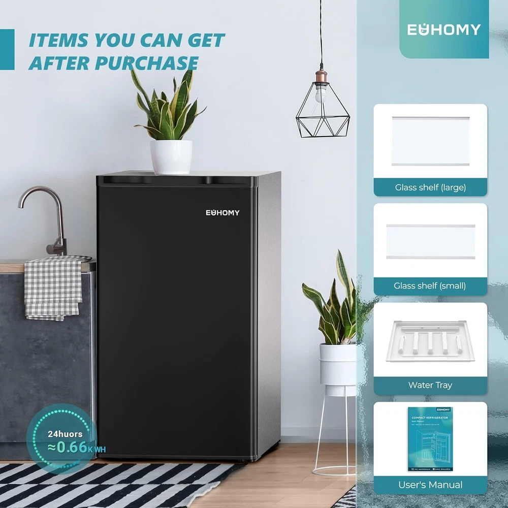 Compact Refrigerator Energy Conservation - Our mini fridge consumes as low as 0.66 kWh per day, it is energy saving. In addition, mini refrigerator design is more humane, it also comes with a drip tray to make it easier for you to collect condensation when defrosting ingredients Refrigerator & Micro Freezer - 3.2 Cu.ft large capacity mini fridge with freezer contains 2.9 Cu.ft Refrigeration section (25℉~44℉) and 0.3 Cu.ft micro-freezer section (23℉~41℉). The micro-freezing section of the small refrigerator allows for short-term storage of a variety of meat products and is equipped with a water catch pan underneath for easy defrosting or cleaning when the power is off Compact Design - Compact Refrigerator size: 19 "D x 17.5 "W x 31.1 "H. Top of the dorm fridge has reversible hinges, so you can change the opening direction at will according to the placement. This is a mini fridge for bedroom, kitchens, dormitories, and offices with a compact form factor that takes up only 2.2ft² Thoughtful Details - This small fridge runs at only 38dB, it is a quiet work of art. The frigobar mini has a 7-position temperature control knob, which can precisely adjust the temperature (Model 3 is recommended for daily use). The bottom of the refrigerators are equipped with adjustable feet, which makes it easy to adjust the placement angle of the rv refrigerator on uneven ground Accessories & Services - EUHOMY professional team to provide you Immediate service, ready to respond to your needs. Product packing list: single door refrigerator *1 Removable glass shelf *2 User manual*1 Drip tray*1