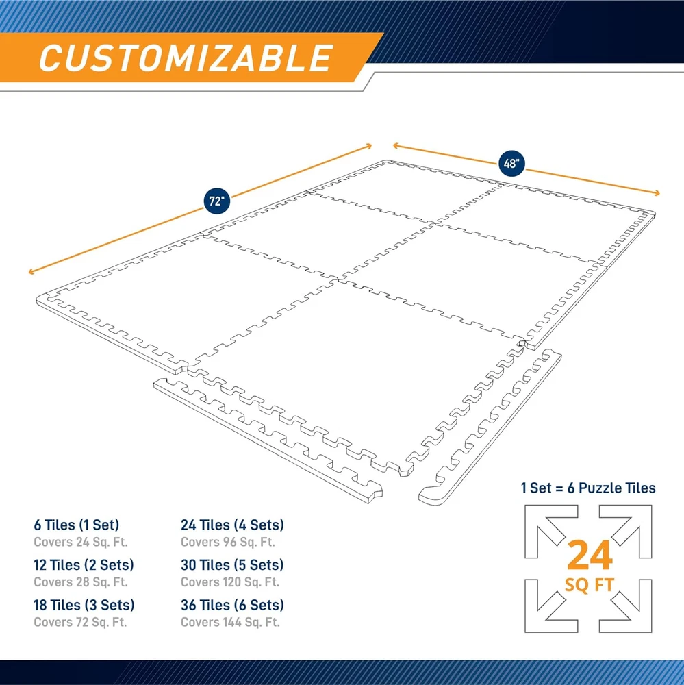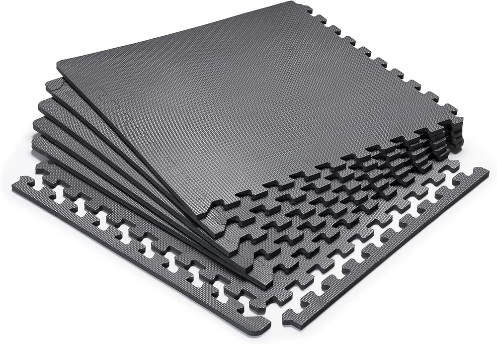 EVA Foam Interlocking Flooring Mat High Density Non-Slip Tiles for Fitness New FOAM FLOORING –This floor mat is built to precision with premium-quality materials. Featuring a lightweight and waterproof surface that is effortless to clean, the non-slip, anti-fatigue ½ thick foam is convenient, durable, and perfect for home use QUALITY UNCOMPROMISED – Each piece of mat is manufactured for long-lasting durability. Unlike other floor mats, Marcy floor mat does not compromise on quality or performance INTERLOCKING COVERAGE MATS – This high-performing gym accessory comes in units of 2 x 2 feet with interlocking edges for easy assembly. It can cover up to 24 square feet of floor space – making it the perfect workout and training accessory HIGH-IMPACT – This anti-fatigue foam flooring offers maximum space, comfort, and protection. Its durable non-slip foam padding will protect and provide comfort to any surface, including your athletic equipment. 26.5 inches x 26.7 inches x 3.83 inches. Weight: 2.74 kg Warranty Description 2-year limited warranty. Number of Items 1 Item Weight 5 Pounds Pattern Solid Country of Origin China Style 1/2" Thick 6 Tiles (24 Sqft) Package Weight 2.74 Kilograms Suggested Users unisex-adult Model Name MAT-20 Item Package Dimensions L x W x H 26.7 x 26.5 x 3.83 inches Included Components six 24"x24" square tiles Item Thickness 0.5 Inches Sport Type Exercise and Fitness Material Type Free Ethylene Vinyl Acetate (EVA), Free of Polyvinyl Chloride (PVC), Free of Lead, Free of Silicone, Free of Bisphenol-A (BPA), Free of Phthalate, Free of Latex Special Feature Non-slipAnti-Fatigue Part Number MAT-20 Item Dimensions LxWxH 72 x 48 x 0.5 inches Color Black - 0.5 Inch - 6 Tiles (24 Sq Ft) Material Ethylene Vinyl Acetate (EVA) Shape Square Global Trade Identification Number 00096362958004 Model Year 2007 Product Dimensions 72"L x 48"W x 0.5"Th Size 72"L x 48"W x 0.5"Th