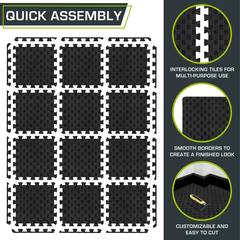 Exercise Puzzle Mat ½ in, Checkered EVA Foam Puzzle Floor Mat with Detachable Interlocking Foam Tiles, Gym Flooring for Cushioned Workout Environment, Foam Mat for Shock Absorption COMPACT WORKOUT AREA: Crave a home gym but tight on space? Lay down our 12-piece foam floor tiles, instantly creating a cushioned workout space! Need more room? Grab the 36-tile gym mats and triple up ADAPTABLE FLOORING: Craft your perfect workout space, big or small, with our detachable interlocking floor mats. Start with just 2 foam floor mats and expand to infinity VERSATILE USE: Gym floor tiles by day and play mat tiles by night. The cushion and durability of our tiles make them perfect for any occasion, particularly as foam mats for kids HIGH-QUALITY FOAM: Sweat it out on resilient EVA foam flooring tiles: high-intensity workouts cushioned, joints protected, surroundings shielded OPTIMAL CONVENIENCE: These floor padding mats grip tight, shrug off spills and cushion your every move Shipping We offer FREE shipping on all orders! We ship within Three business days of payment, usually sooner. We use a selection of shipping services such as UPS, FedEx, USPS etc. We only ship to the lower 48 states, no APO/FPO addresses or PO Boxes allowed. Local pickups and combined shipping options are not provided at this time. Return You can return a product for up to 30 days from the date you purchased it. Any product you return must be in the same condition you received it and in the original packaging. Please keep the receipt. Payment We accept payment by any of the following methods: PayPal Please pay as soon as possible after winning an auction, as that will allow us to post your item to you sooner! Feedback Customer satisfaction is very important to us. If you have any problem with your order, please contact us and we will do our best to make you satisfied. Contact Us If you have any queries, please contact us via ebay. We usually respond within 24 hours on weekdays. Please visit our eBay store to check out other items for sale! Thank you for shopping at our store.
