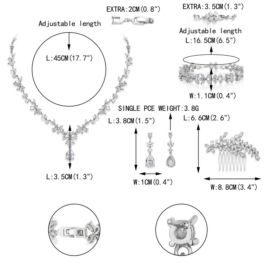 EVER FAITH Wedding Jewelry Sets for Women Brides Bridesmaids, White Gold Plated Floral CZ Bridal Necklace Dangle Earrings Bracelet Hair Comb Set Product Details Package Dimensions : 5.91 x 3.54 x 1.54 inches; 4.97 ounces Item model number : N12836-1 Department : womens Date First Available : July 26, 2022 Manufacturer : EVER FAITH Brand, Seller, or Collection Name: EVER FAITH Metal stamp: Not stamped Metal: Brass Material: Cubic Zirconia Gem Type: Cubic Zirconia Setting: Prong-Setting Chain: Other Chain Type Clasp: Fold Over Clasp Number of stones: 29 Model number: N12836-1