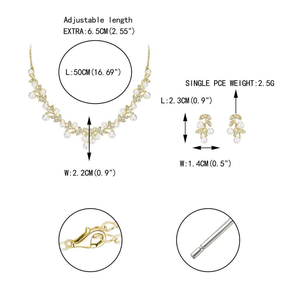 EVER FAITH Women's Weding Jewelry Simulated Pearl Vine Leaf Bowknot Bridal Bride Necklace Earrings Set Product Details Color: A_White Simulated Pearl Gold-Tone Brand: EVER FAITH MPN: N03345-2 UPC: Does not apply EAN: Does not apply Is Discontinued By Manufacturer : No Package Dimensions : 4 x 2 x 2 inches; 1.16 ounces Department : womens Date First Available : May 25, 2018 Manufacturer : EVER FAITH Brand, Seller, or Collection Name: EVER FAITH Metal stamp: Not stamped Metal: alloy Material: Crystal Item Length: 5 inches Height: 0.7 inches Width: 14 inches Length: 11 inches Chain: Curb Clasp: Lobster Clasp Resizable: No Model number: N03345-2