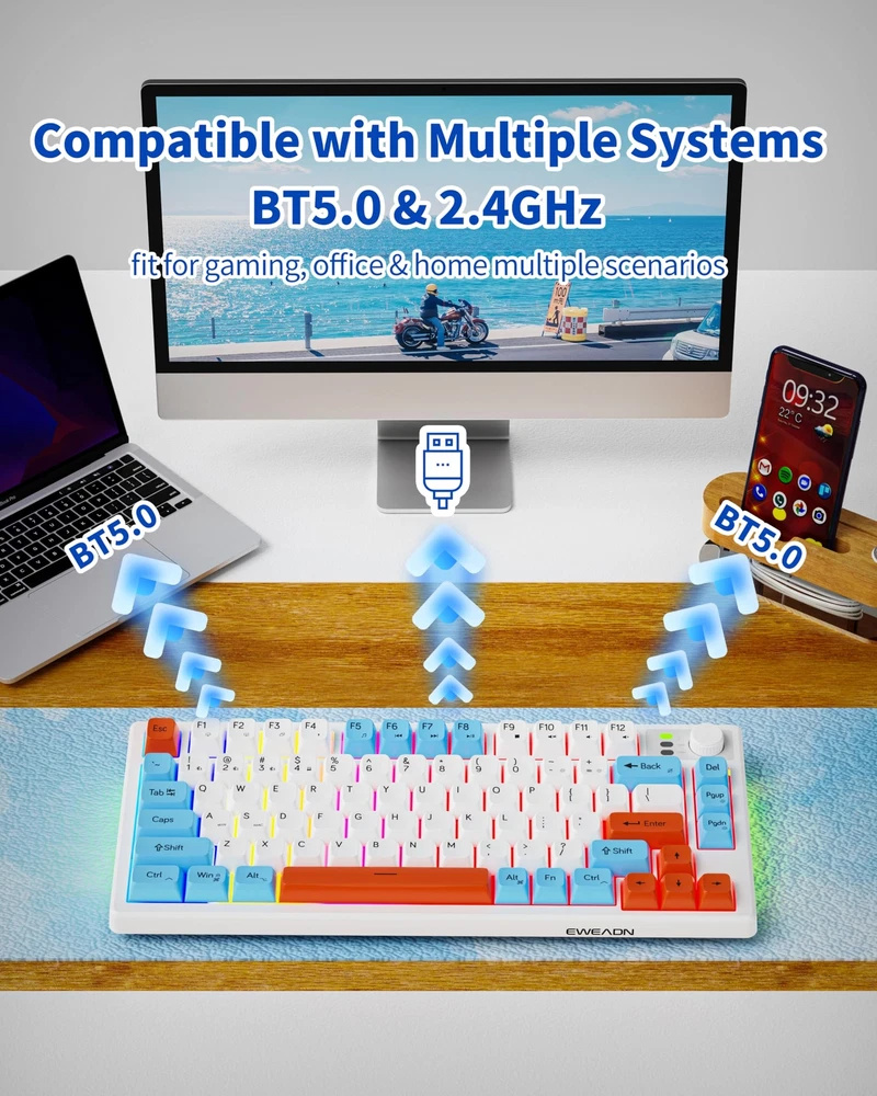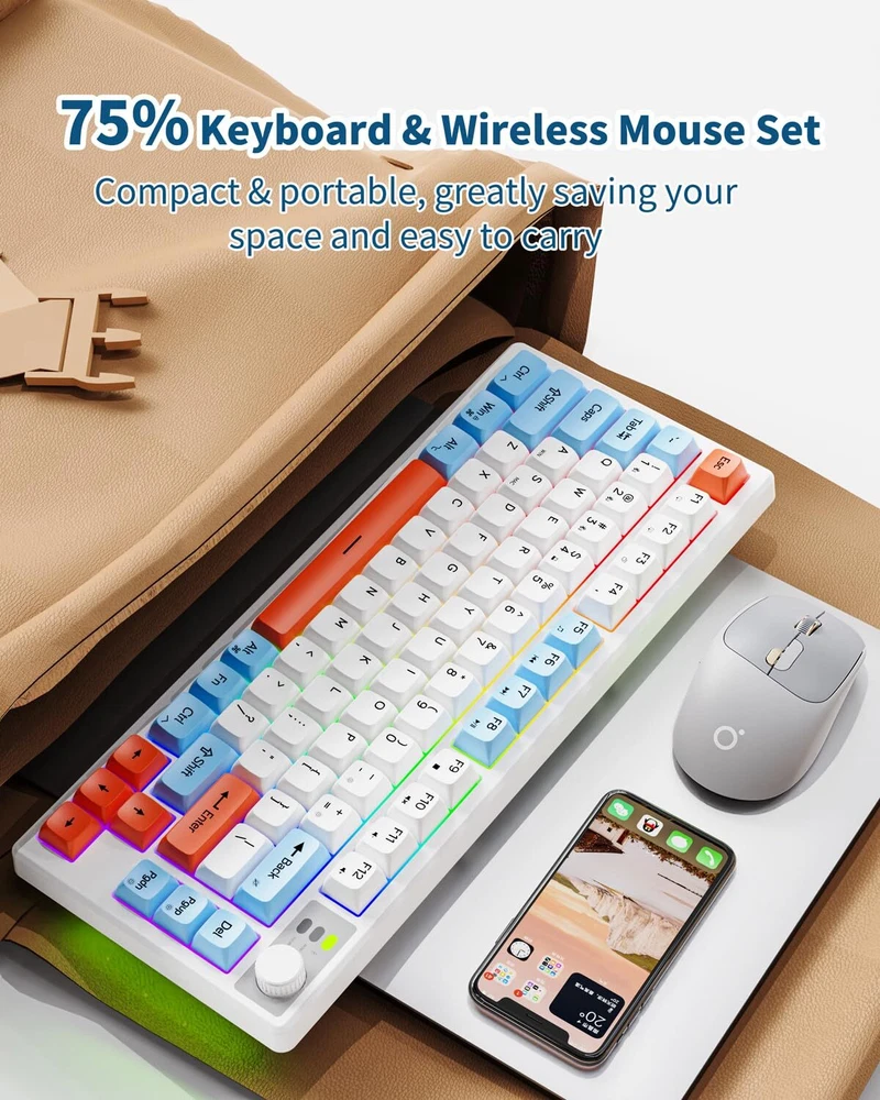 75% Layout Gaming Keyboard and Mouse: The EWEADN V75 is a high-performance membrane wireless gaming keyboard. Designed with ergonomics in mind, with its 81-key 75% compact design, making it perfect for streamlined desks and mobile setups without compromising on functionality. Two-mode Connectivity: The V75 Wireless Gaming Keyboard and Mouse combo offers Bluetooth and 2.4GHz 2 connection methods which can meet your work, game, and study needs. can connect to three devices at the same time, "FN+1/2/3/4” can switch BT1/BT2/BT3/2.4G mode at any time. Adjustable RGB Backlighting: Wireless gaming keyboard with vibrant tri-color keycaps and RGB rainbow backlighting, not only enhances aesthetics but also improves visibility in low-light environments. This themed keyboard is compatible with both Mac/Win systems. side light bar design adds a great atmosphere to the game. Multi-function Control Knob: This wireless keyboard with a functional knob controls the audio/backlight. Press the knob for about 3s to switch modes. The right-corner power display light to clearly keyboard power. The M-LED is red for low battery needs charging. Rechargeable & Power-Saving: The gaming keyboard and mouse are equipped 1500mAh battery and mouse 500mAh battery; Charge them easily with the included USB-C cable, and enjoy long-lasting battery life, no more charge frequently.in addition, The membrane gaming keyboard and mouse share ONE receiver, plug and play.