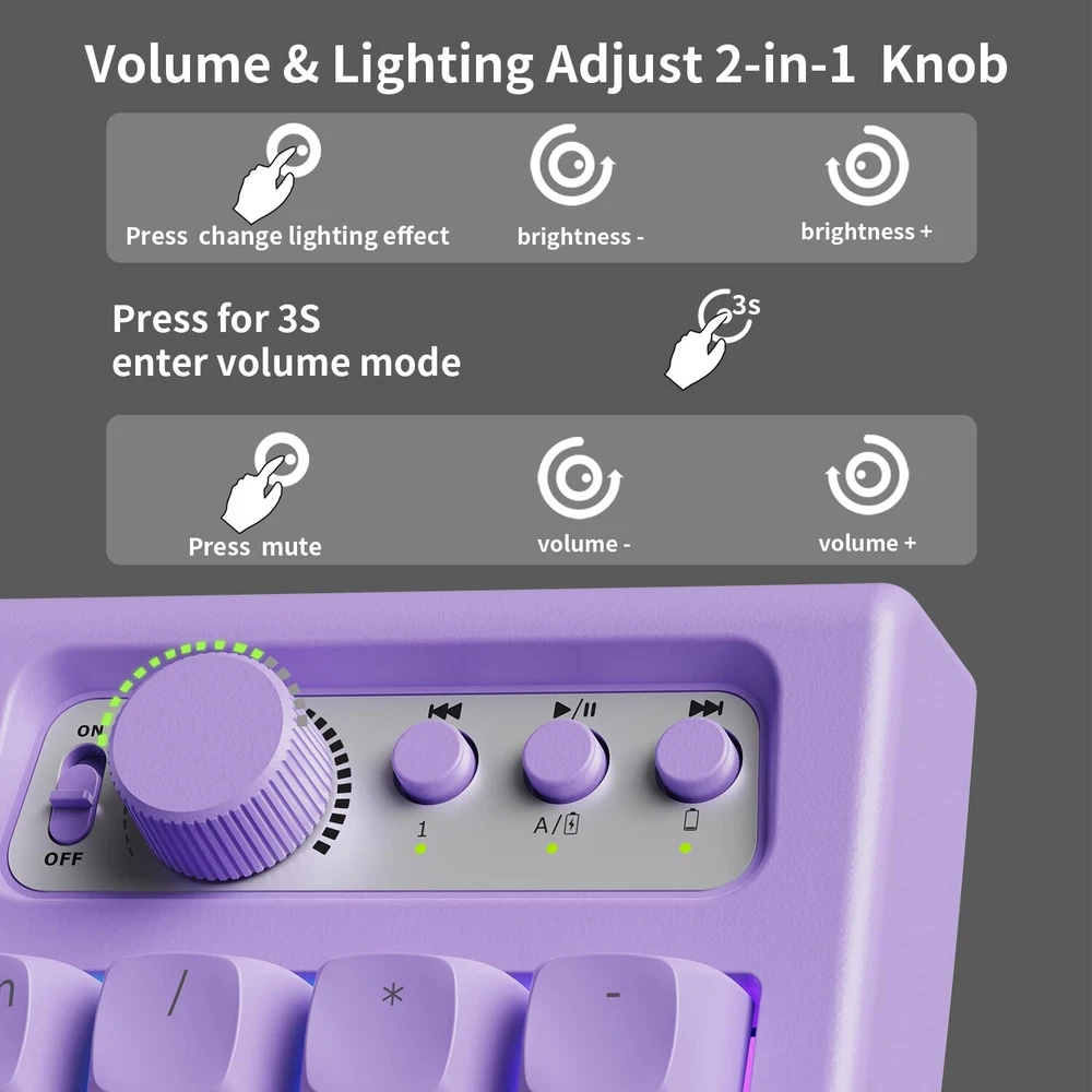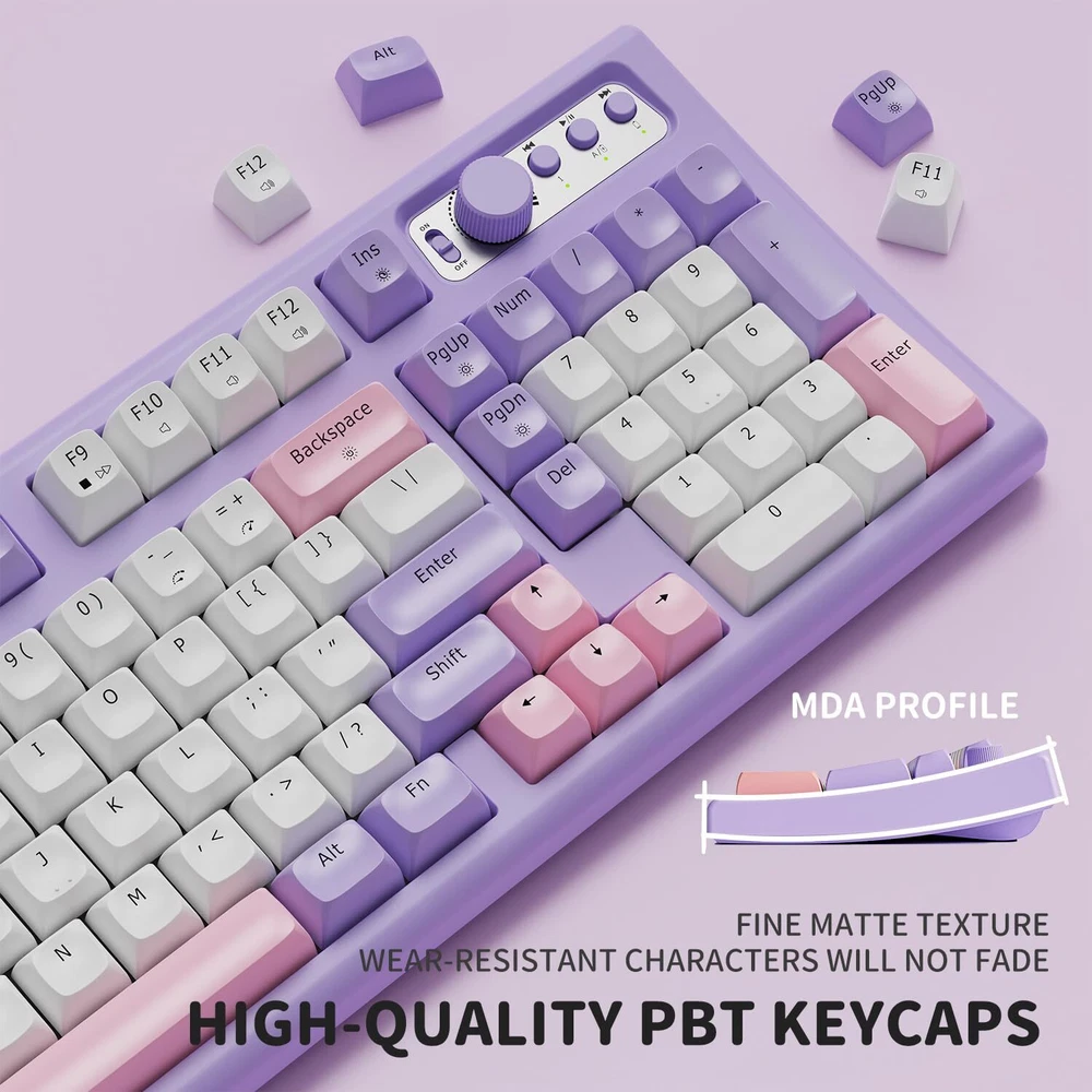 【Modes & Rechargeable】: EWEADN V97 cute keyboard wireless provides connection methods, Bluetooth 5.0 and 2.4GHz. Meet your work, game and study needs. Bluetooth can connect to three devices at the same time. "FN+1/2/3/4” can switch BT1/BT2/BT3/2.4G mode at any time. Built-in 2000mah energy-saving battery and equipped with Type-C cable. You can use this cable to charge the purple keyboard gaming any time. 【RGB Backlit Keyboard & 11 Effects】: V97 ligh up keyboard features RGB lighting color. With 11 pre-set lighting effects to add a great atmosphere to the game. 9 levels brightness for your choice, brightness and speed can be adjusted by the knob. You can select the single or rainbow color as wish. And if you can turn the backlight off if you do not need it. 【Unique Curved Body & Durable PBT keycaps】: RGB keyboard has unique design, and the body presents smooth arc. Tilt angle is about 7°, and the ergonomic stepped keycap layout can perfectly fit the arc of your fingers and wrists, easier to type and no longer feel tired at work or games. In addition, the wireless bluetooth keyboard uses smooth and delicate PBT keycaps, with rounded and smooth edges and great tactile feel. 【Volume & Light 2 in 1 knob and Power Display 】: No more fumbling for volume/light buttons or browsing menus to adjust volume/light. 2.4GHz/Bluetooth wireless gaming keyboard equipped with functional knob, easily adjust volume & light(11 types). Rotate the knob to adjust the brightness of the lights & volume. Press the knob for about 5s to switch modes. With power display light, clearly grasp the power of the cute keyboard white. Low battery indicator light flashes, the charging status indicator light is always on, and the full charge indicator light goes off. 【90% Compact Layout and Mac/Win Compatibility】: This 97-key layout EWEADN keyboard is compact and more practical, saving more desktop space while retaining the main function keys needed for office or gaming. More importantly, this bluetooth gaming keyboard wireless is fully with Mac, Windows and other systems, whether you are a MAC or WIN user, you can use the pc keyboard! Press and hold "Fn" & "A" to enter the Win system, and "Fn" & "S" to enter the Mac system. 【Doing Responsibly and Sustainably】: As a responsible company, EWEADN operates sustainably, to high environmental and social standards. We continue to embed sustainability ever deeper in the way we do business – in our own operations and beyond, together with our suppliers. The usb keyboard cute also comes with 24-month brand support. Our expert team always stands by your side.