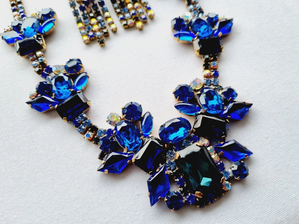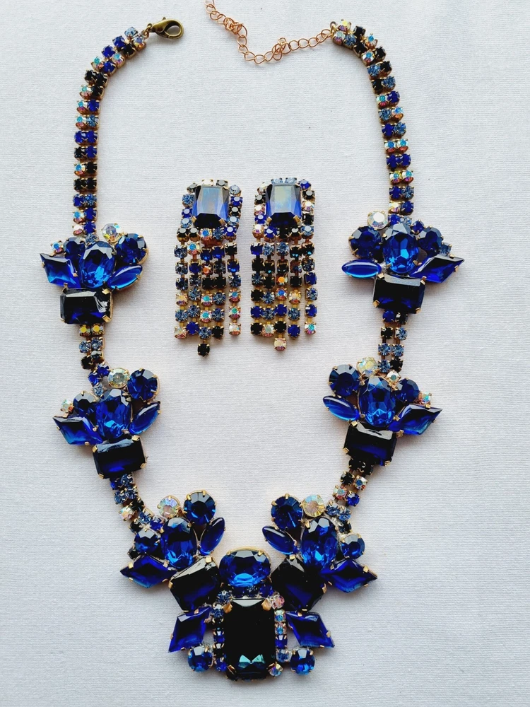 welcome on my auction here is nice multicolor rhinestone Necklace and Earring made in Czech Republic vintage the Necklace set are perfectly fine no missing stones Necklace size in centimeters 40 length Earring size in centimeters 8 lenght I send the goods the next day after payment. combine postage charge avaible thank you for your time!