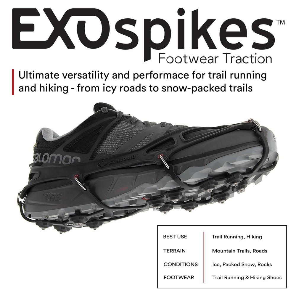 EXOspikes footwear traction sets a new standard for versatile winter traction that delivers true cross-terrain performance for trail runners and hikers. Designed to take a beating, EXOspikes introduces an industry-first TPU Traction Matrix that is more lightweight and abrasion resistant than steel and enables users to take on a mix of terrain and conditions—including frozen mountain trails, icy roads, and everything in between. EXOspikes combine more than decades of winter traction technology and experience, and embody the high performance, reliability, and safety outdoor enthusiasts expect from . BEST FOR: Winter hiking, backpacking, and trail-running. EXOspikes footwear traction are designed to be lightweight and abrasion resistant, enabling users to take on a mix of terrain and conditions—including frozen mountain trails, icy roads, and everything in between on your backcountry winter adventures! Ideal for hiking shoes and boots and to be used on mountain trails. SPIKE DESIGN: 12 spikes per foot deliver three levels of optimal traction. Tungsten carbide tips bite into icy terrain, aluminum steps grip uneven surfaces, while the TPU lugs dig into loose terrain. ADDITIONAL FEATURES: Industry-first TPU Traction Matrix is extremely durable and more abrasion resistant than steel. Open design quickly sheds snow and adapts to a wide range of flexible footwear. ELASTOMER HARNESS & REINFORCED EYELETS: Using a patented eyelet design, tough TPU inserts reinforce key points, allowing the elastomer harness to be strong yet lightweight. Constructed from a durable TPE for a secure fit that remains stretchy in cold temperatures, down to -22°F (-30°C). : Est. in 1999 is on a mission to build exceptional products that make the outdoors more accessible and rewarding. Please see sizing chart in product images. 4-year manufacturer . Shoes not included. All traction devices are manufactured in Taiwan.